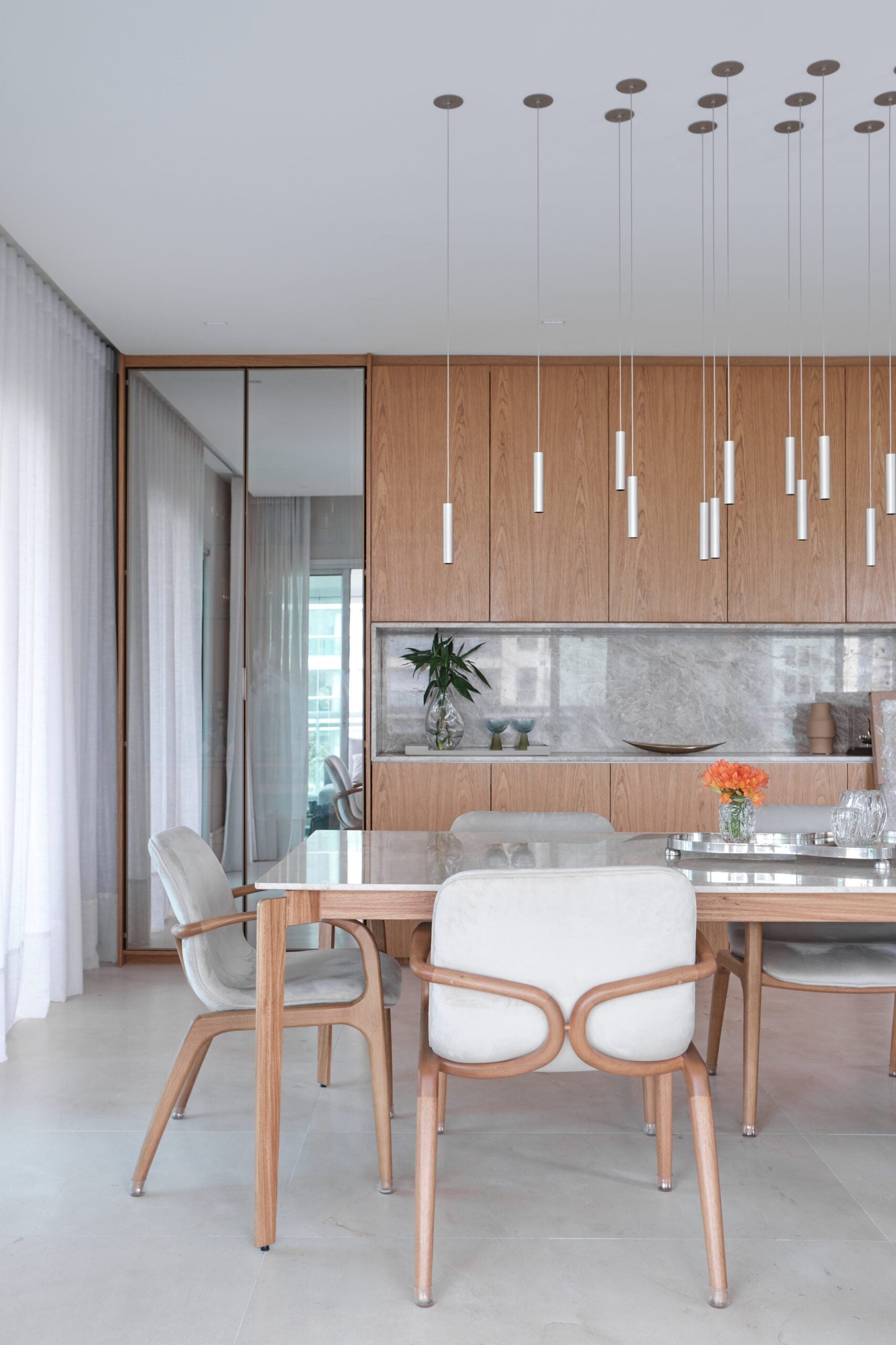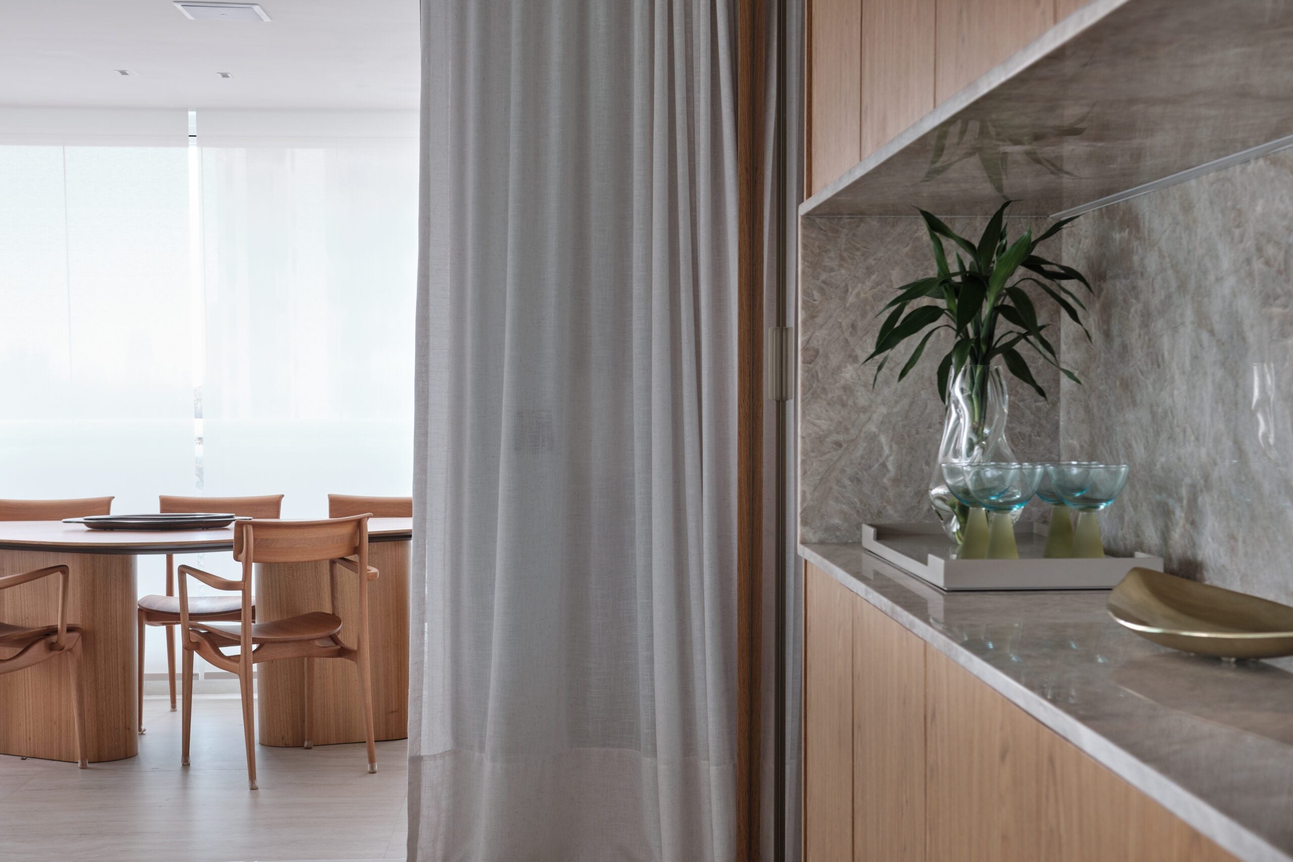 Um dos principais desafios esteve na configuração da sala de estar, marcada por uma planta retangular, poucas paredes e extensas esquadrias. A solução encontrada foi a criação de um grande painel em marcenaria de freijó natural, executado pela Arca de Noé, que organiza o espaço, esconde portas e integra buffet e bar com adega revestidos em quartzito Taj Mahal.