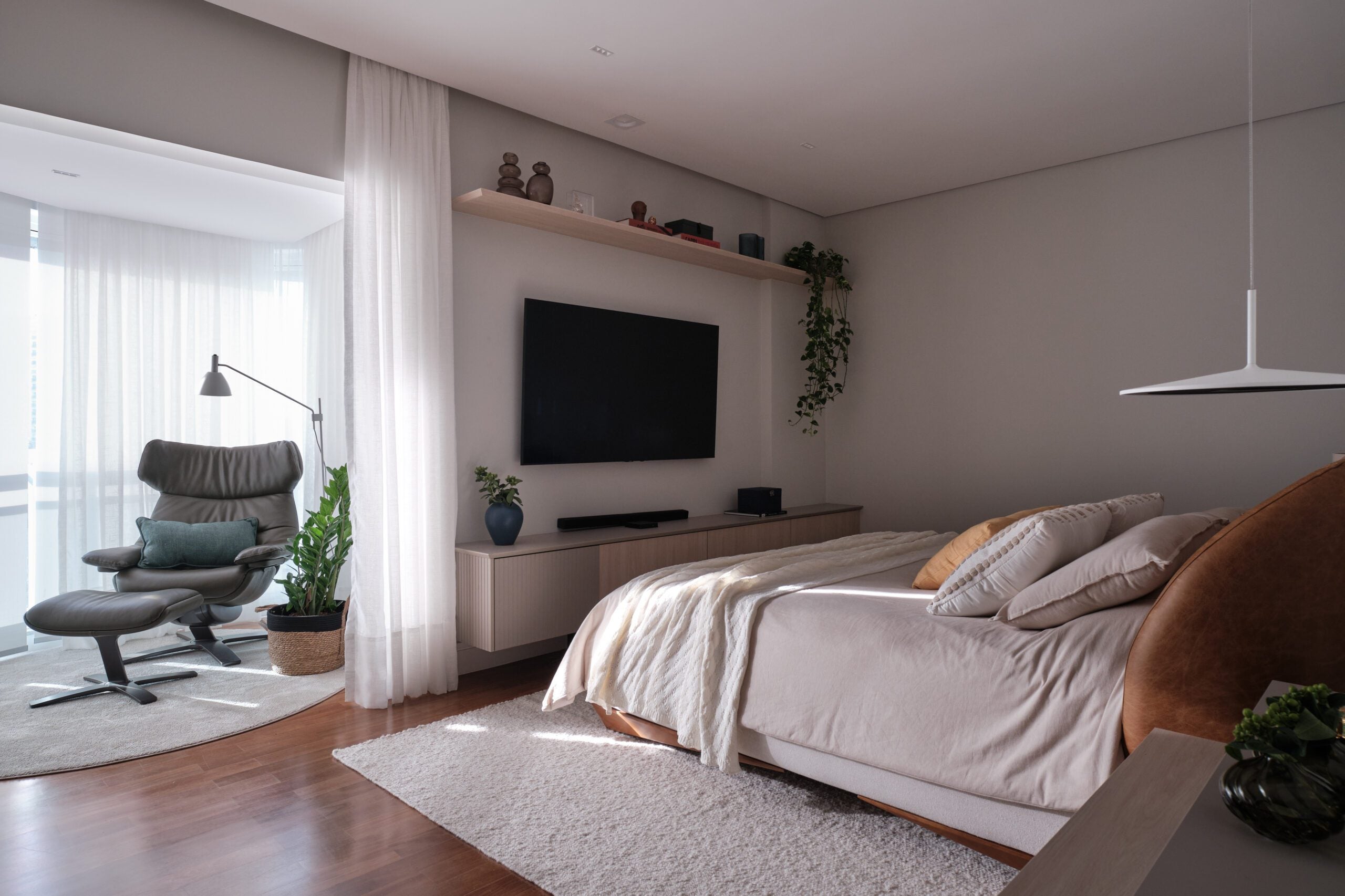 A área social se estrutura a partir da integração entre sala de estar, varanda e cozinha, formando um grande ambiente contínuo e generoso. O living, com 50 m², se abre para a varanda gourmet de mesma proporção, criando uma atmosfera ensolarada, fluida e convidativa. A luz natural, protagonista do projeto, é potencializada por uma paleta de tons neutros e terrosos, pelo uso da madeira freijó e pelo quartzito Taj Mahal, que trazem textura, calor e sofisticação na medida certa.