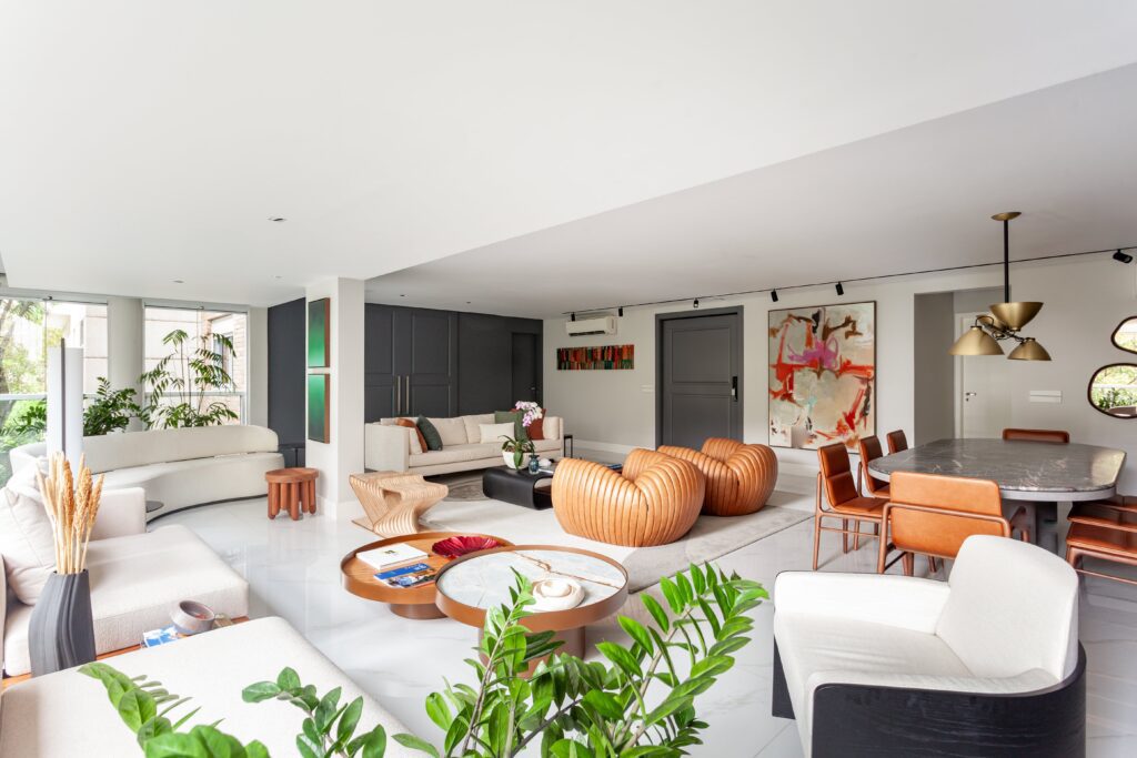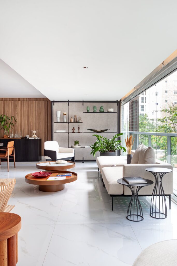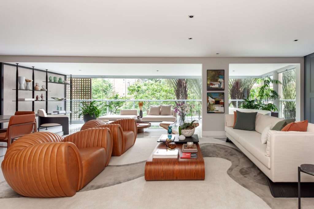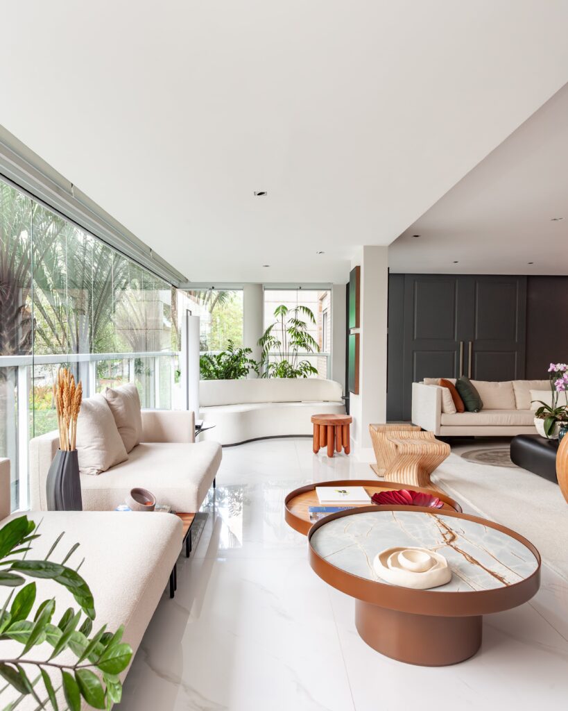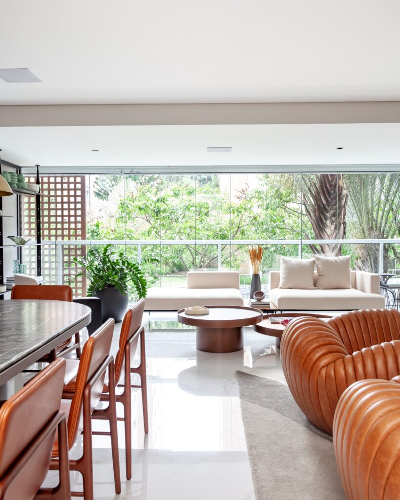 A varanda foi integrada à área social, ganhando elegância e reforçando a sensação de amplitude. A nova disposição dos móveis trouxe um sofá de formas orgânicas, que une conforto e leveza em uma atmosfera convidativa.
