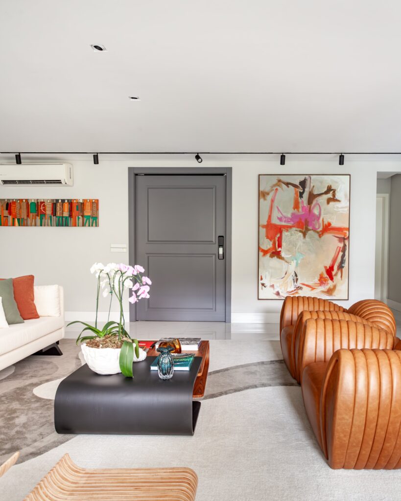 O apartamento manteve os revestimentos originais, com intervenções pontuais em marcenaria e pintura, apostando em uma base neutra para valorizar objetos decorativos e obras de arte.