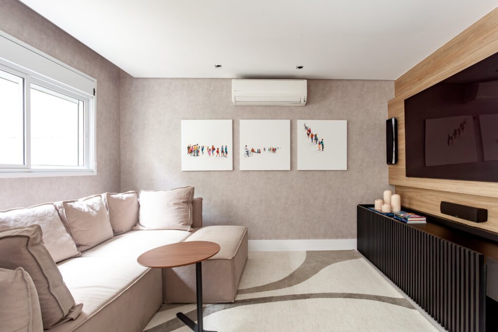 No home theater, a nova marcenaria esconde os equipamentos e garante fácil acesso ao cabeamento, equilibrando funcionalidade e elegância.