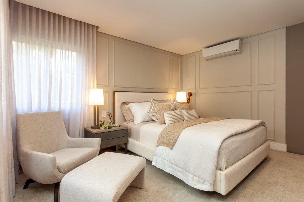 Na suíte master, a proposta destacou uma cabeceira acolhedora e sofisticada, assegurando mais conforto ao espaço. Nos demais ambientes, a marcenaria original foi mantida.