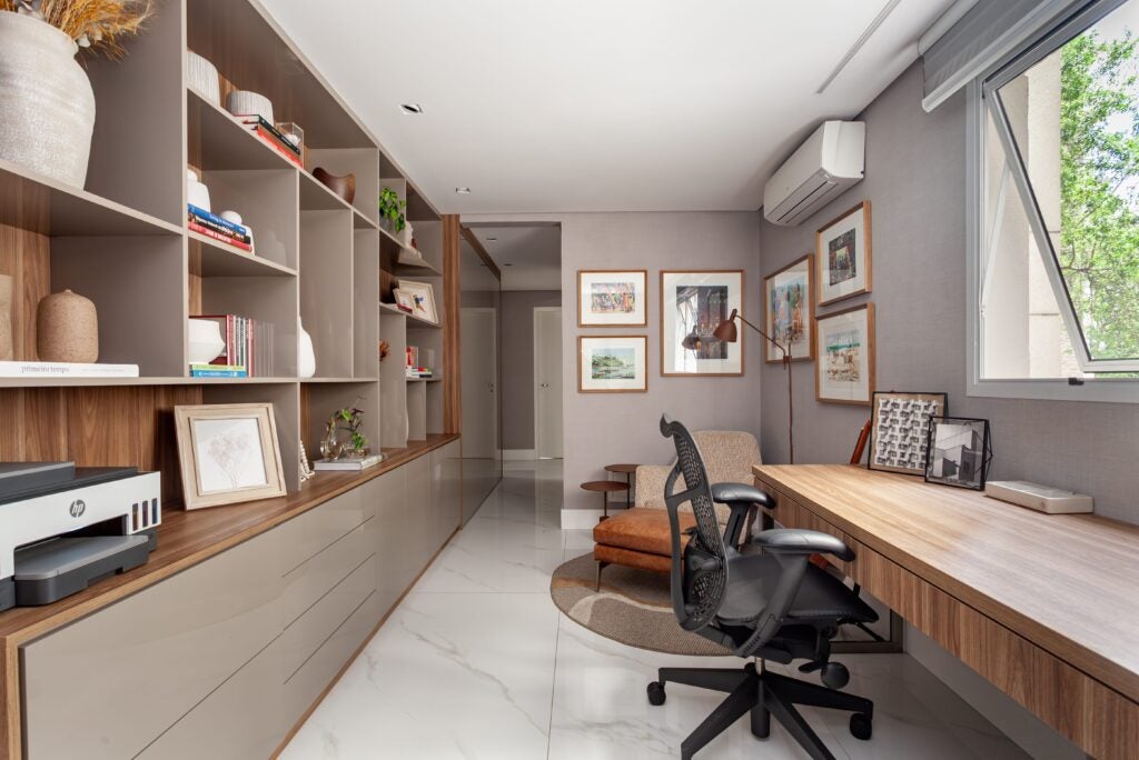 O escritório apresenta uma ambientação leve, funcional e acolhedora para o dia a dia, com destaque para o cantinho de leitura, pensado como um refúgio para pequenas pausas na rotina.