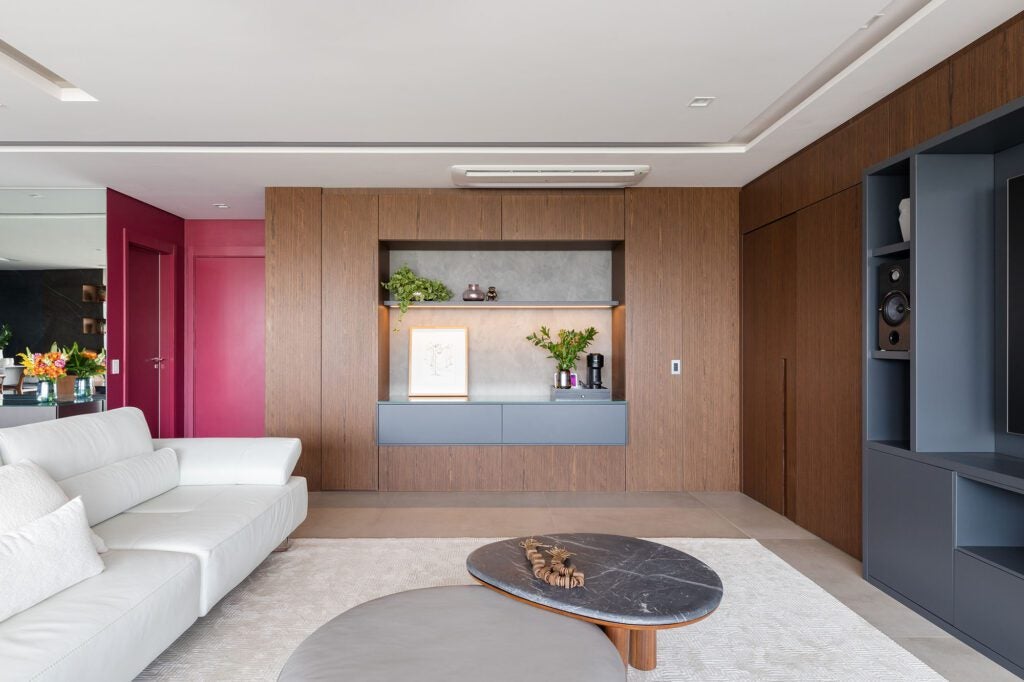 Logo na entrada, o hall se destaca com o uso do tom bordô, que reveste também a porta principal, criando uma atmosfera de personalidade e acolhimento desde o primeiro contato.