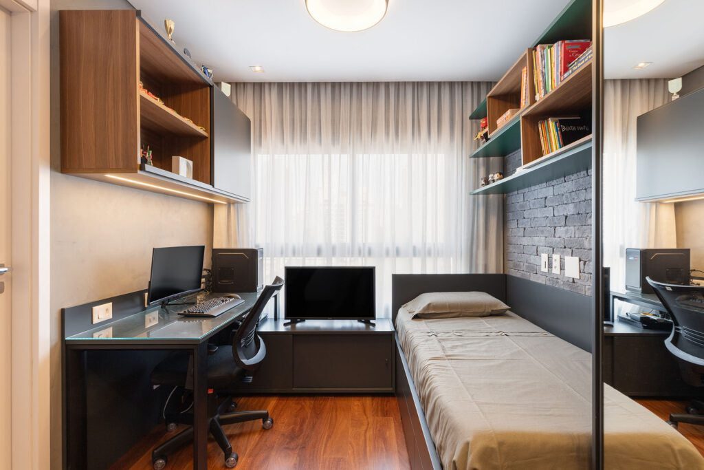 A suíte da filha, multifuncional, conta com bancada de estudos, cama de casal e um espaço com espelho iluminado que organiza sua rotina de maquiagem. Já a suíte do caçula adota um estilo mais urbano, com parede de tijolos aparentes e paleta escura, além de bancada para estudos e área de jogos.