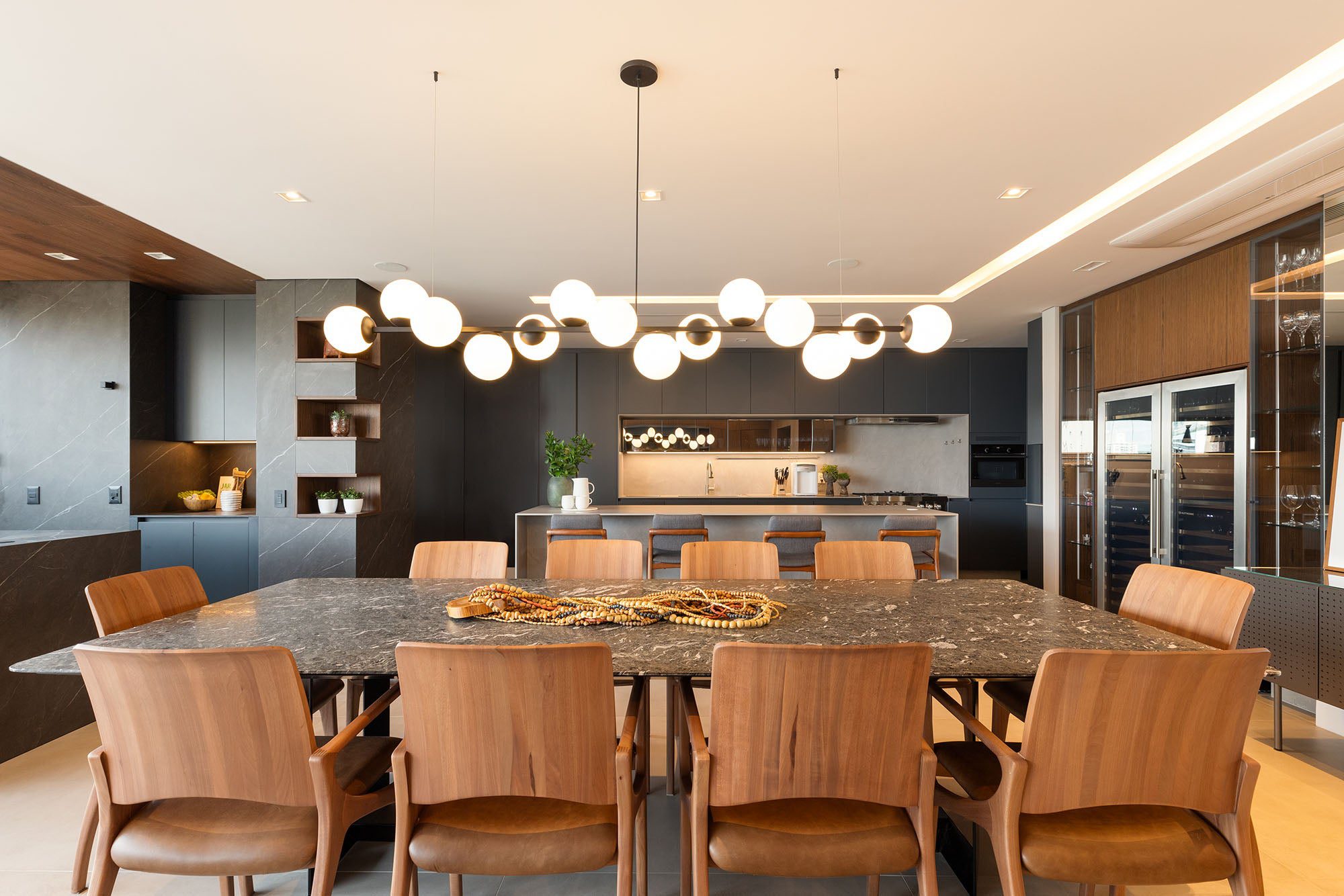 Materiais nobres, como as lâminas que simulam mármore na cozinha e no espaço gourmet, dialogam com a madeira natural aplicada em paredes e forro, responsável por aquecer e acolher toda a área social.