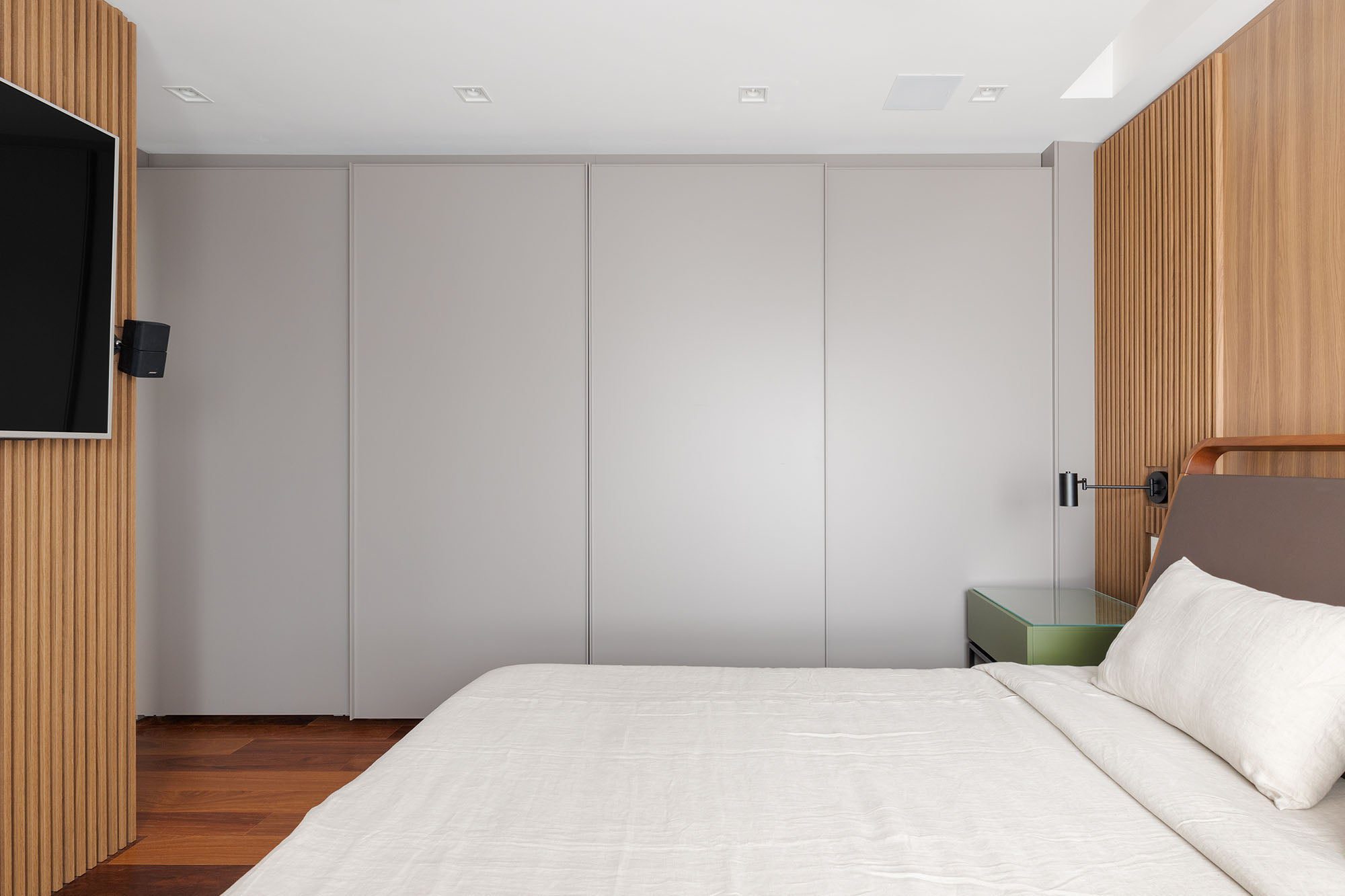 Na área íntima, cada suíte reflete as preferências e rotinas de seus moradores. A suíte master aposta em elementos acolhedores e tons suaves para garantir o descanso do casal, com destaque para o closet espaçoso, planejado para facilitar o dia a dia.