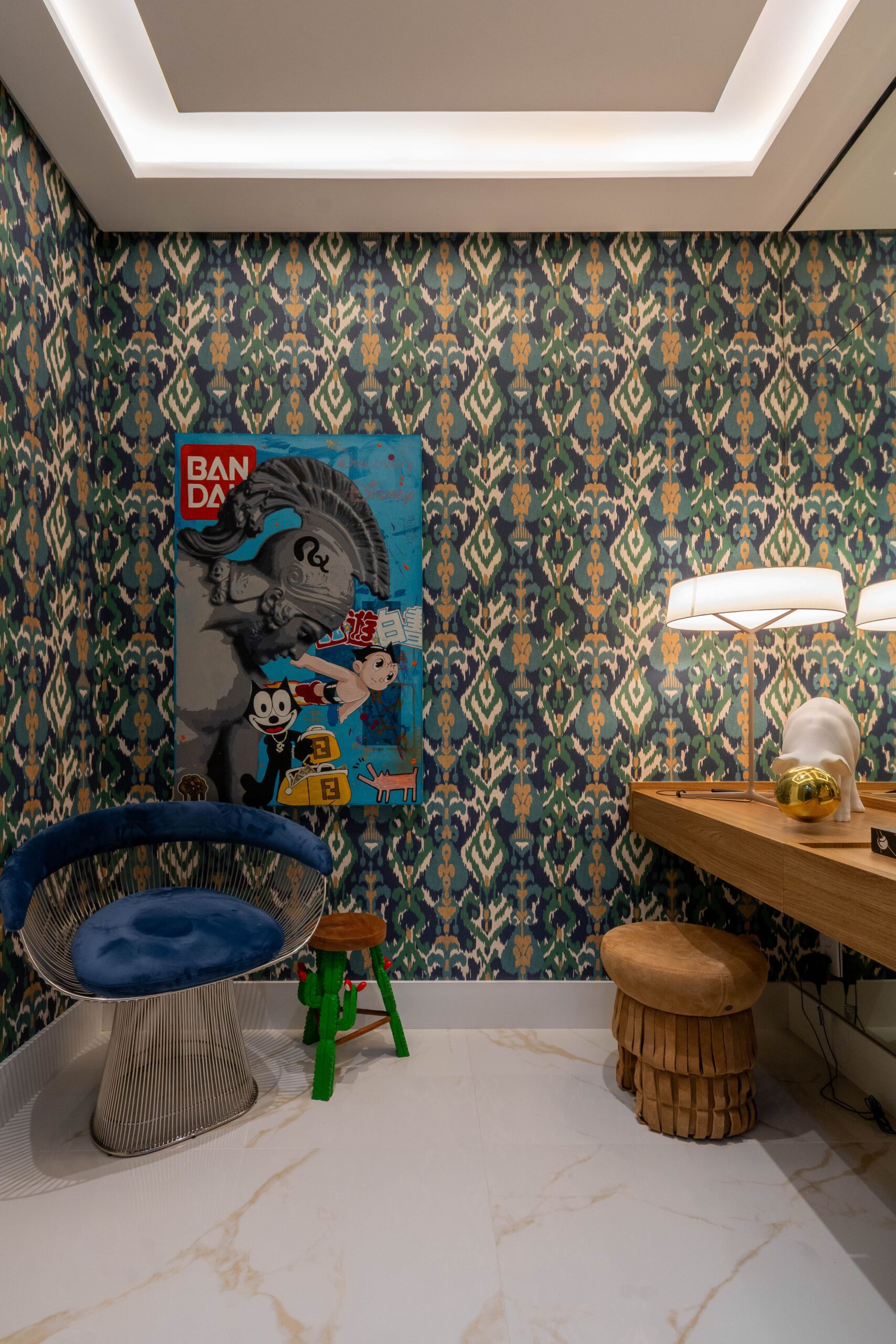 O lavabo combina estampa animal print com a cuba em pedra verde, trazendo personalidade e toques bem-humorados ao ambiente.