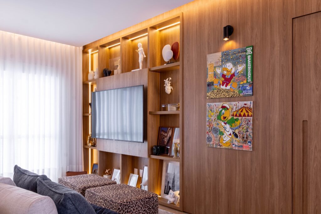 O uso de madeira no painel reforça a sensação acolhedora no espaço de entretenimento.