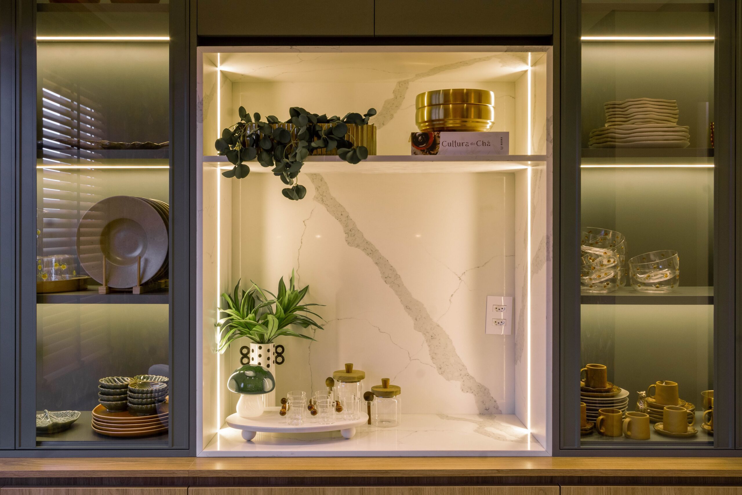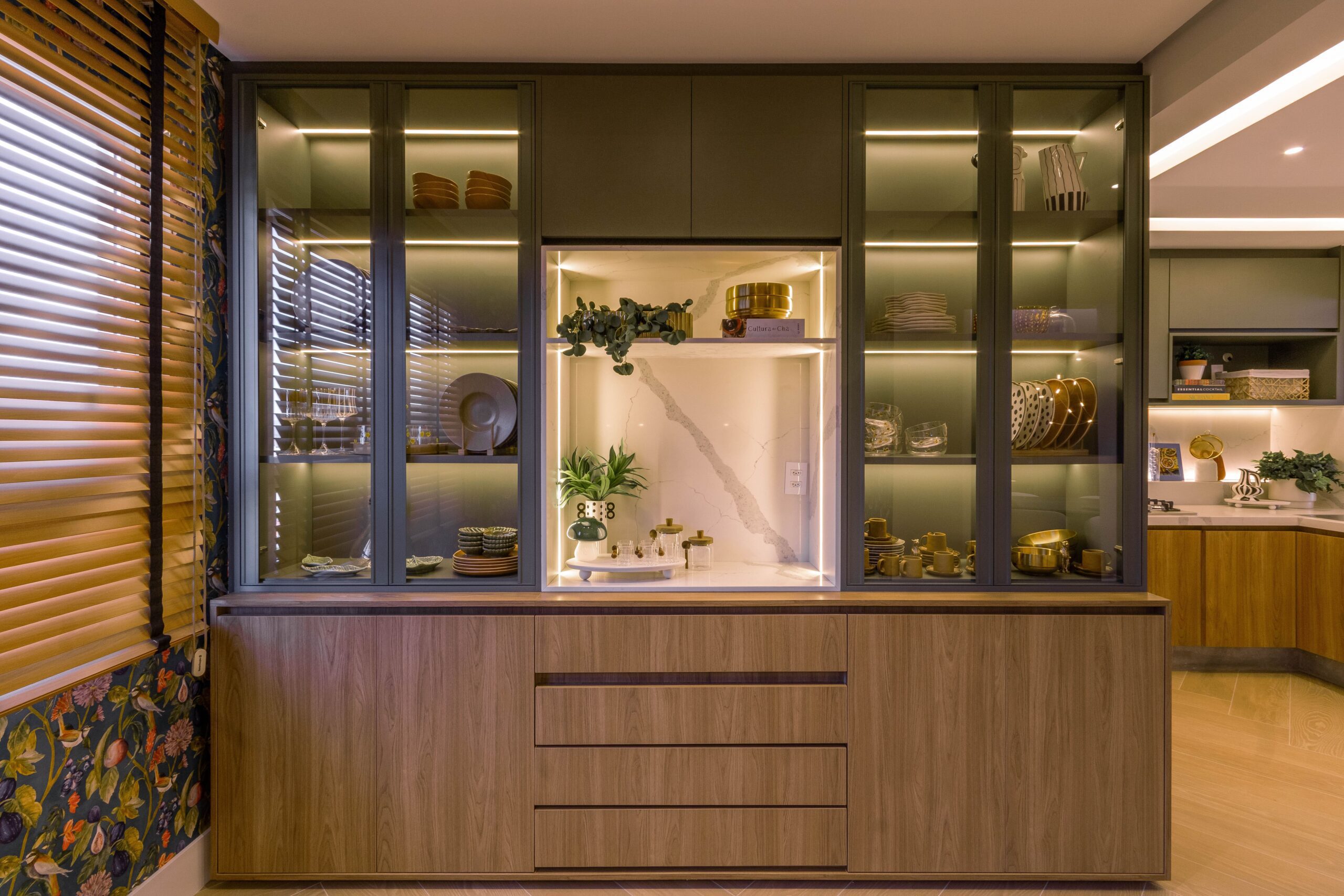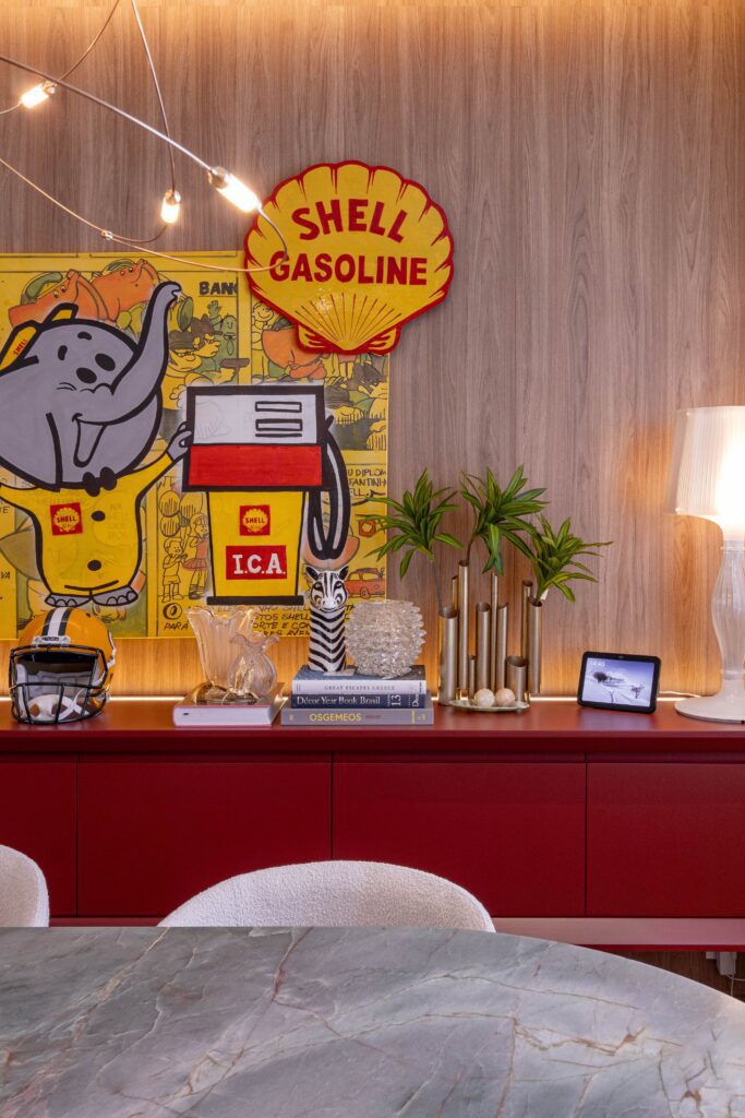 O buffet da sala de jantar recebeu acabamento colorido, tornando-se ponto focal no ambiente social.
