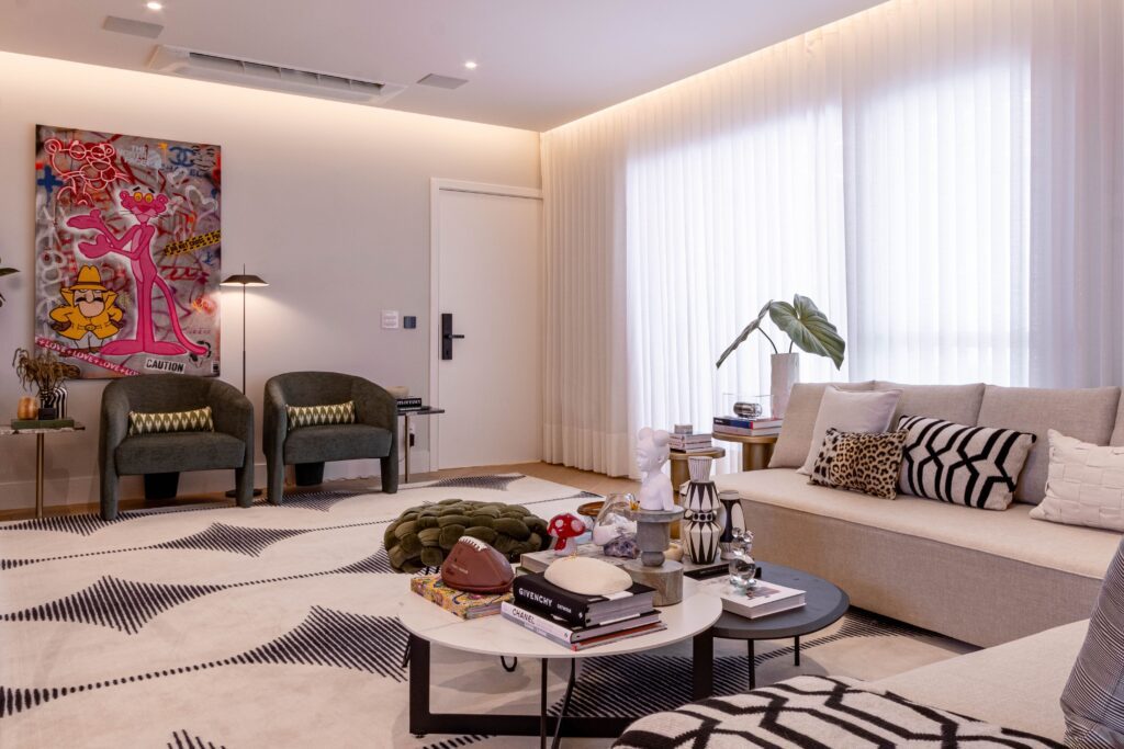 O living ganhou destaque com iluminação especial e acabamentos neutros em contraste com as obras de arte coloridas.