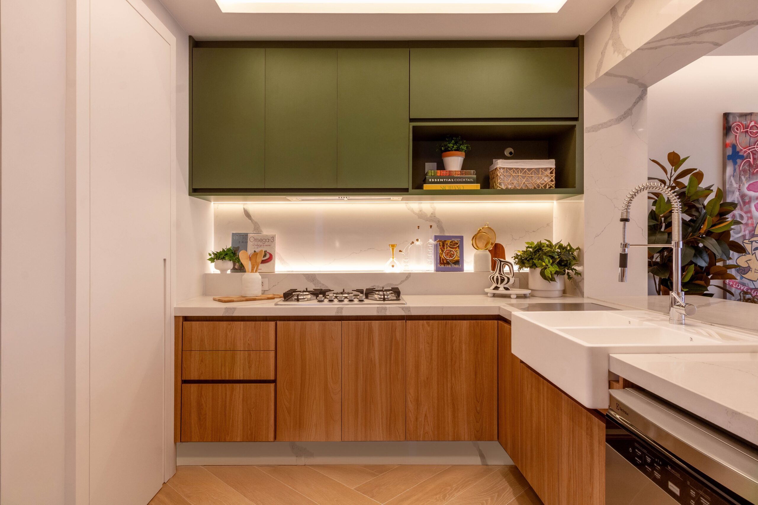 Bancadas em branco ressaltam os laqueados verdes escolhidos para marcenaria e armários.