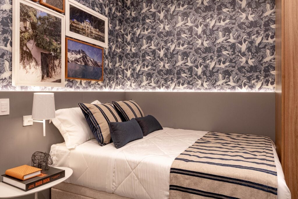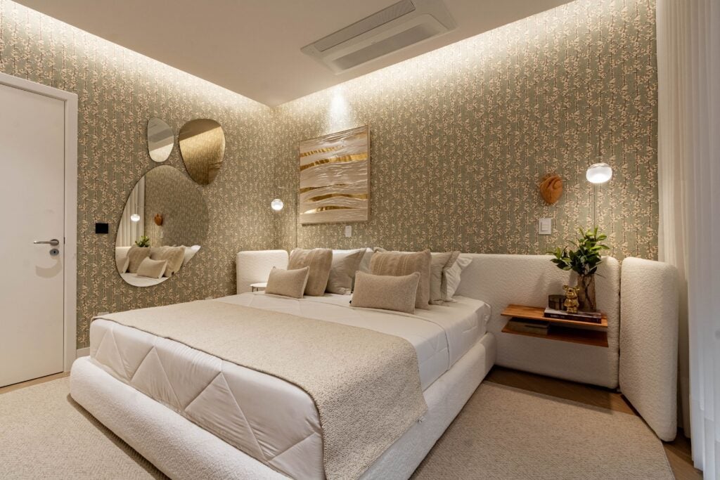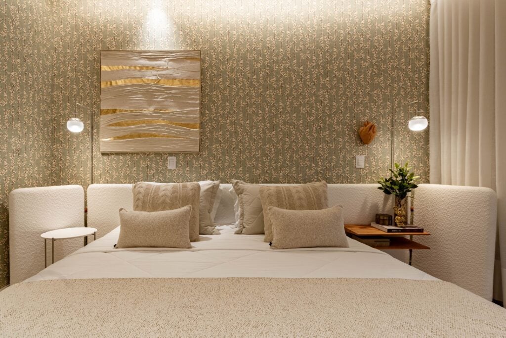 O painel de cabeceira estofado eleva a sensação de conforto.