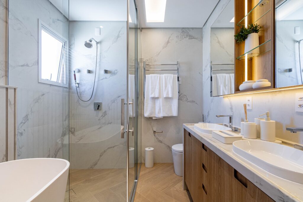 O revestimento em pedra natural eleva a sofisticação do banheiro, enquanto a iluminação planejada valoriza cada detalhe do espaço.
