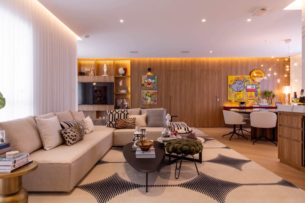 A sala de TV foi integrada à área social, garantindo amplitude e conforto.