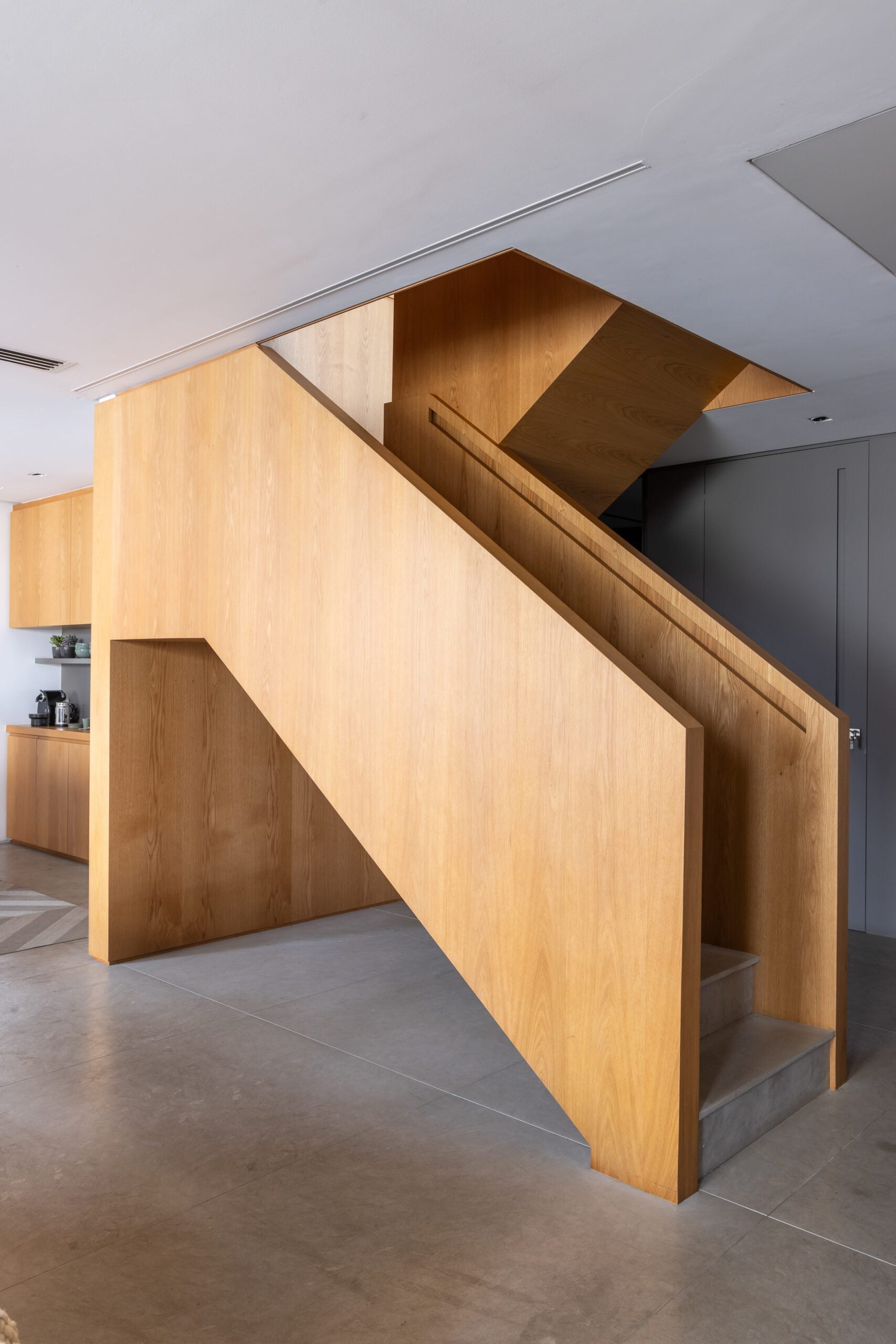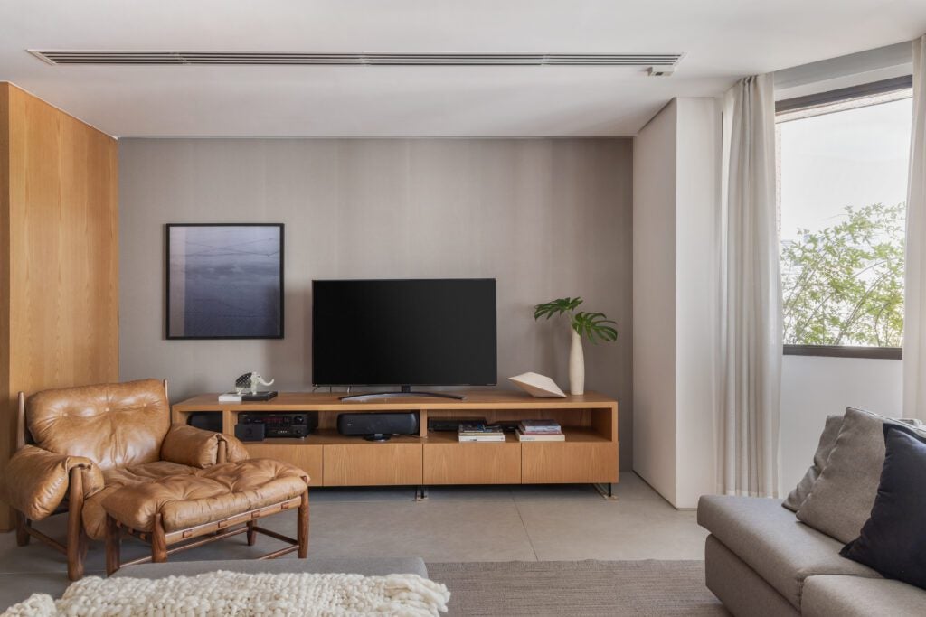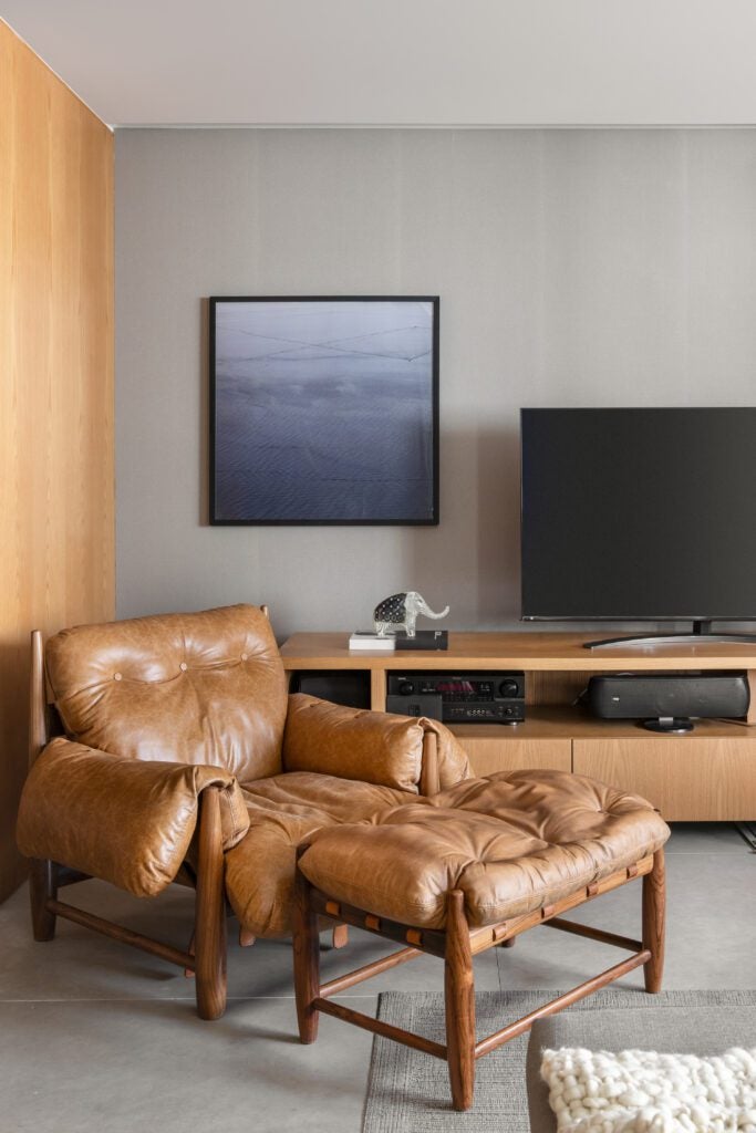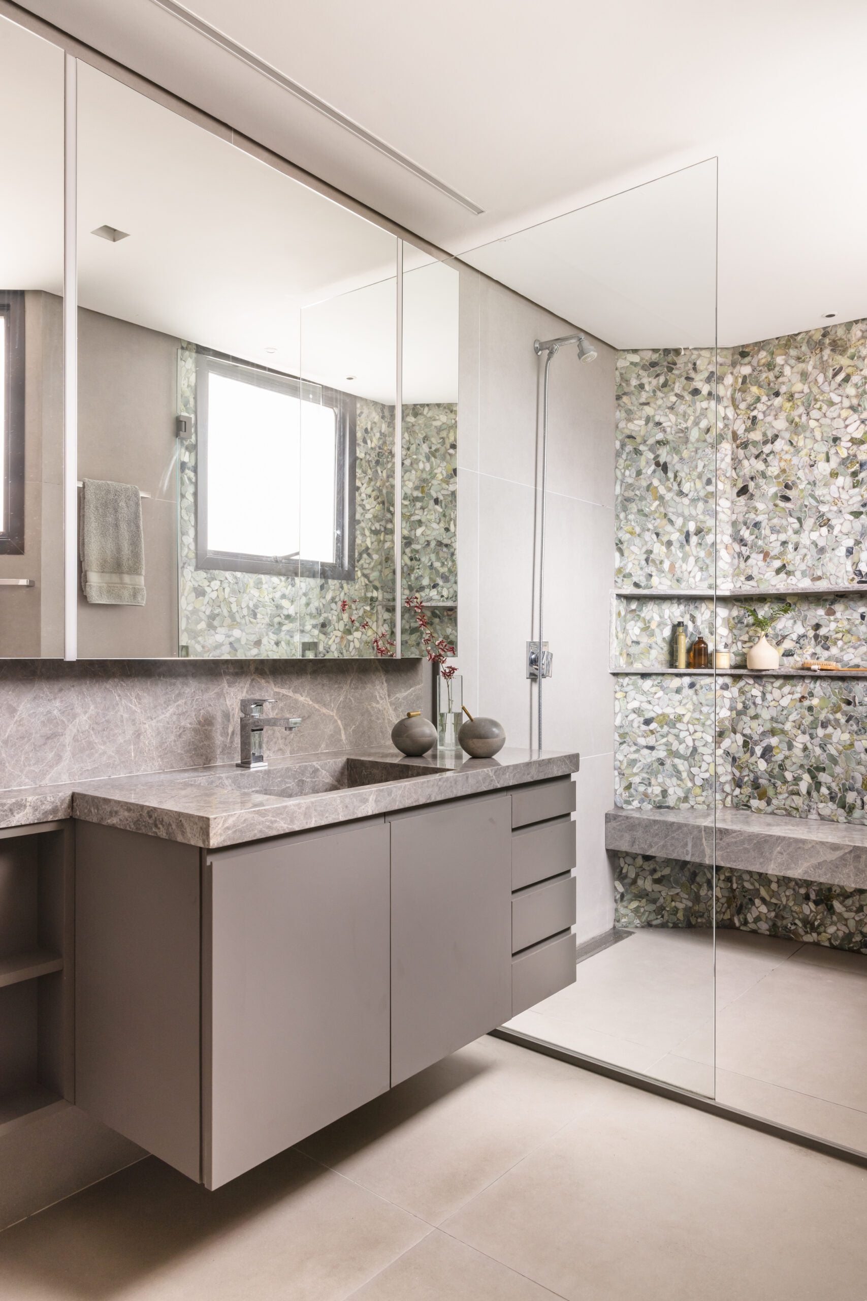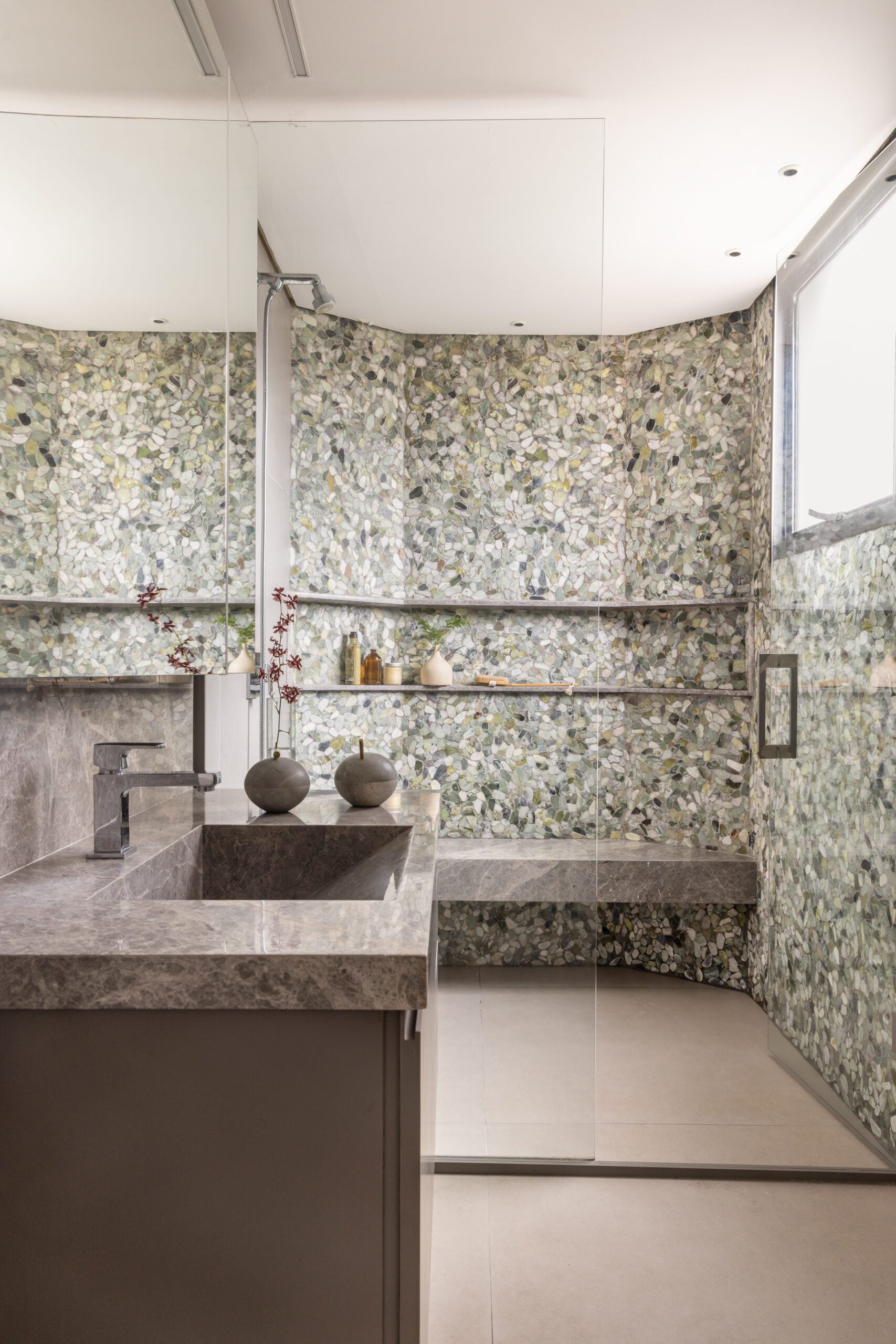 O piso em limestone bateig blue, combinado ao forro em madeira de carvalho europeu no pavimento superior, estabelece a base neutra e sofisticada que se repete nos detalhes de cada ambiente. Na área íntima, tacos de tauari aquecem os espaços privados, enquanto banheiros receberam tampos em quartzito cinza, seixos verdes e acabamentos em Armani Grigio. Para completar, peças de design brasileiro e obras de arte cuidadosamente selecionadas trazem personalidade e força ao conjunto. Poltronas de Sérgio Rodrigues, mesa Pétala de Jorge Zalszupin, mesa de jantar de Jader Almeida e tapetes da By Kamy e Punto e Filo convivem em harmonia com quadros de Chiara Banfi, fotografias de Cláudio Edinger e Ana Nitzan, além de esculturas de Jacqueline Terpins.