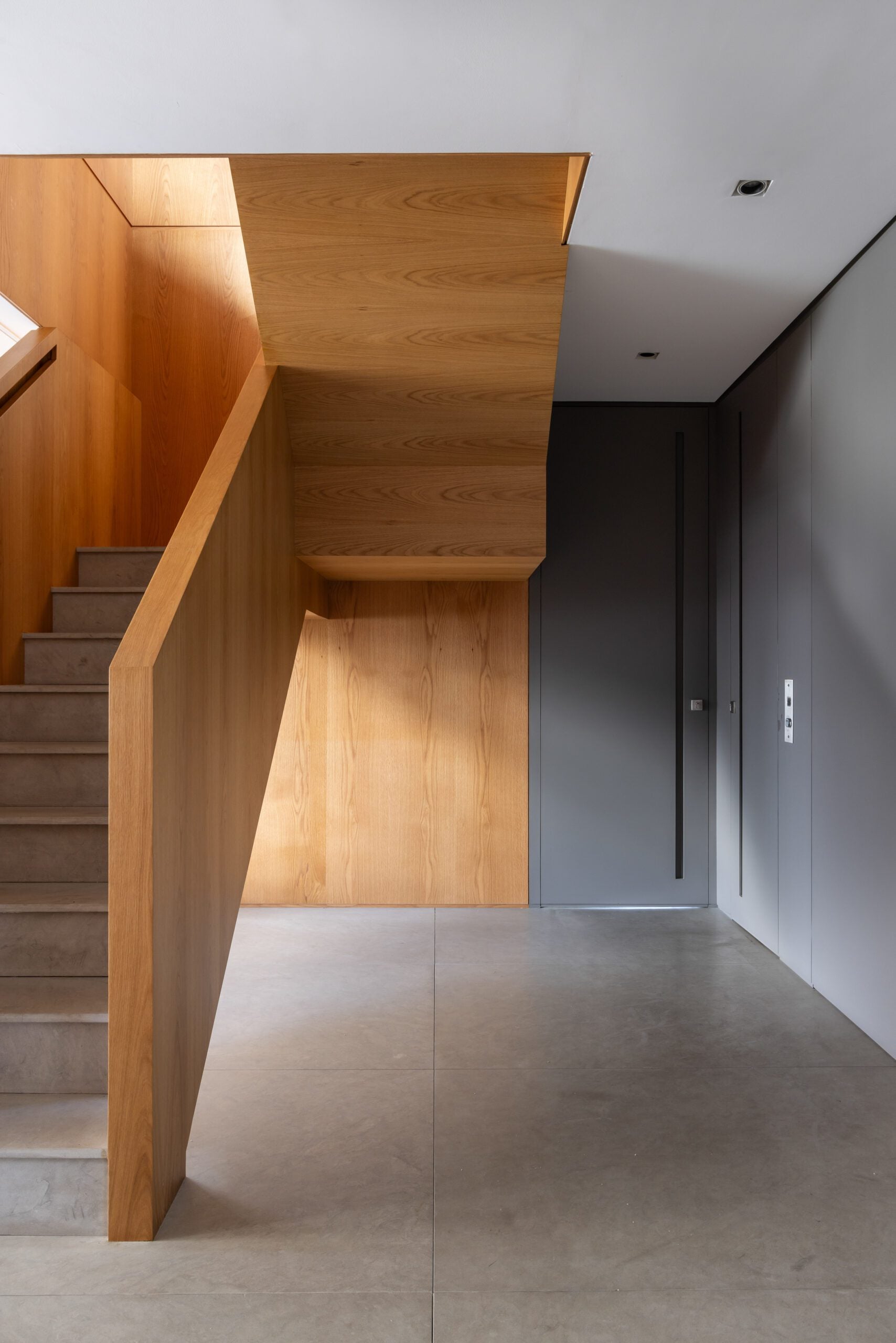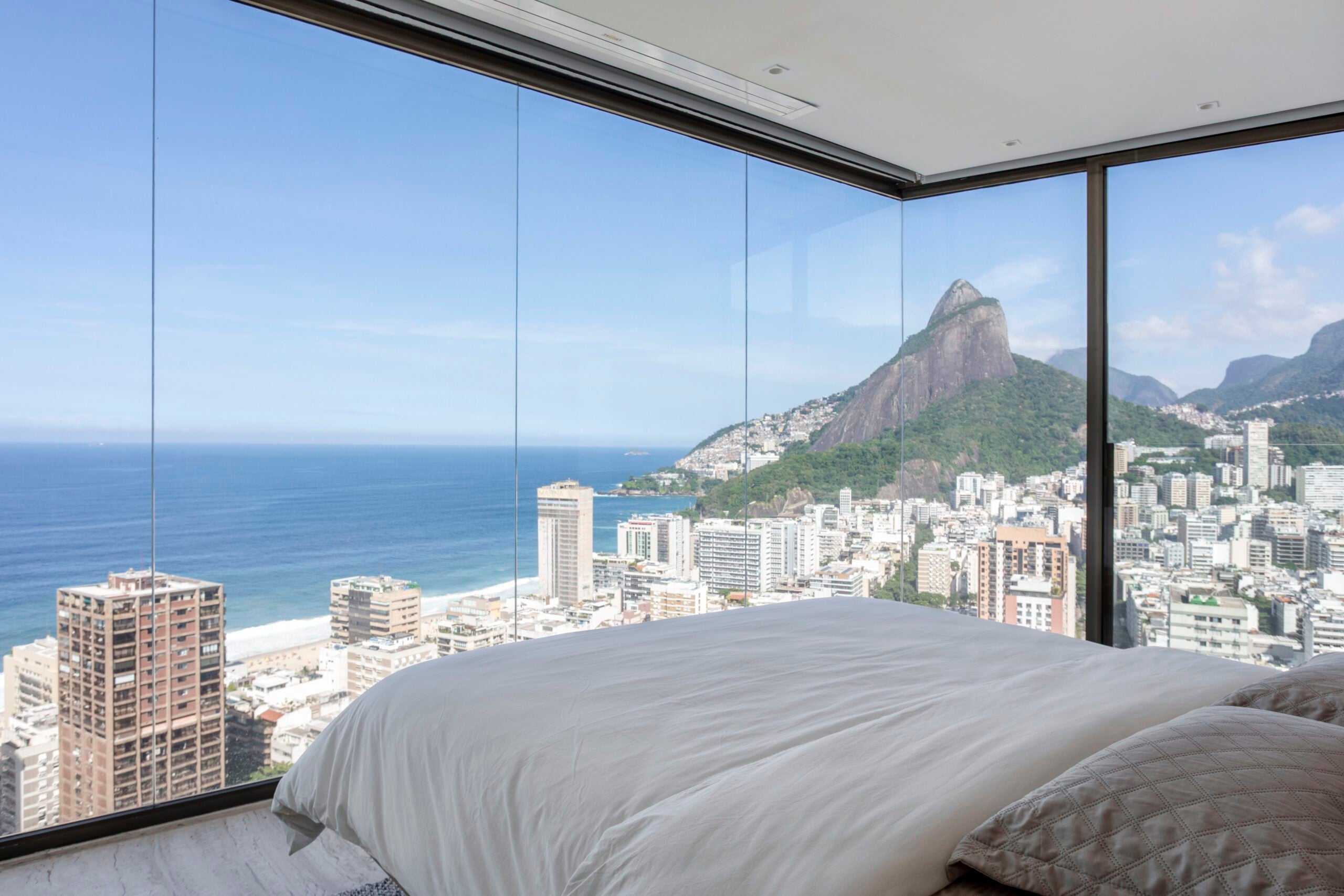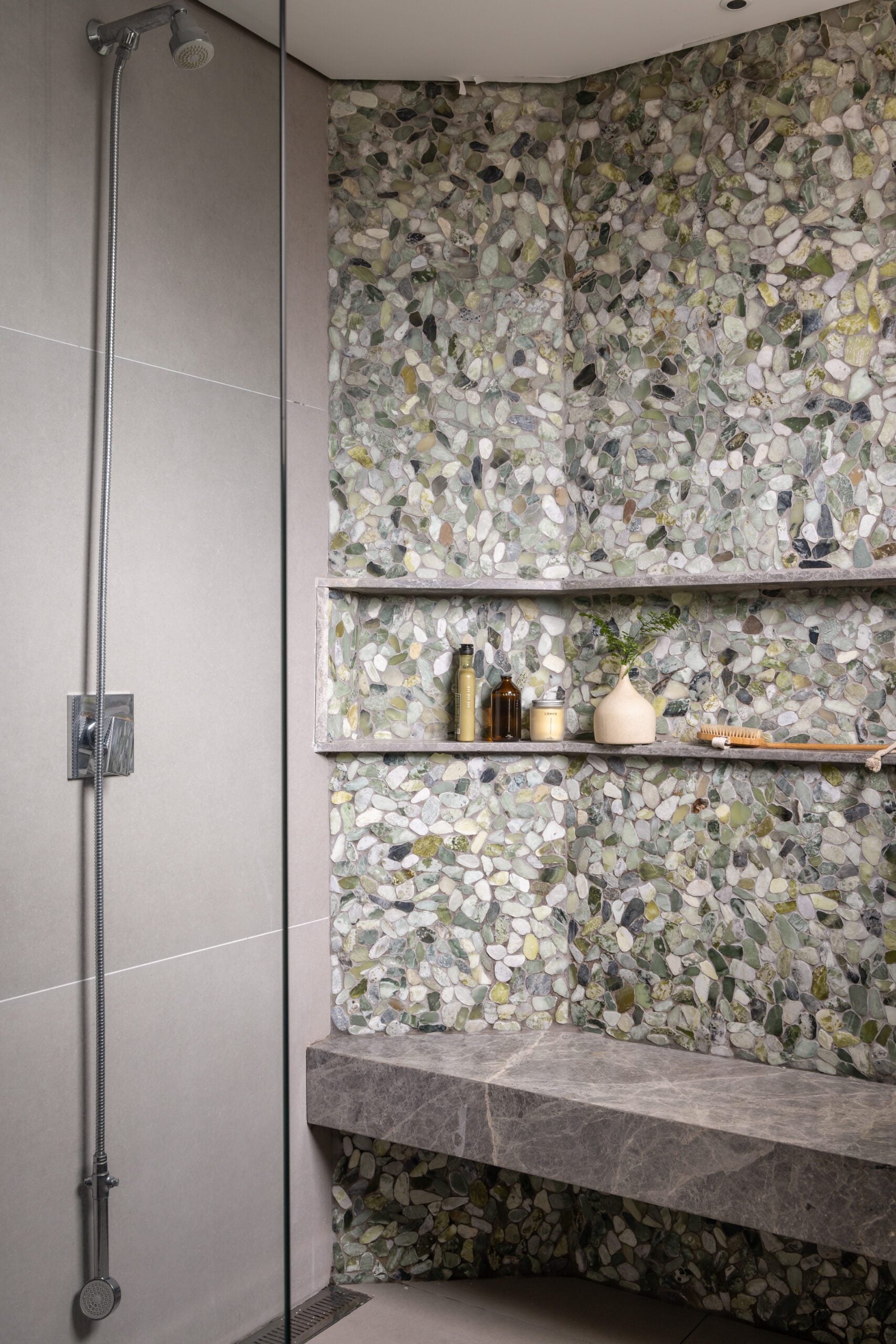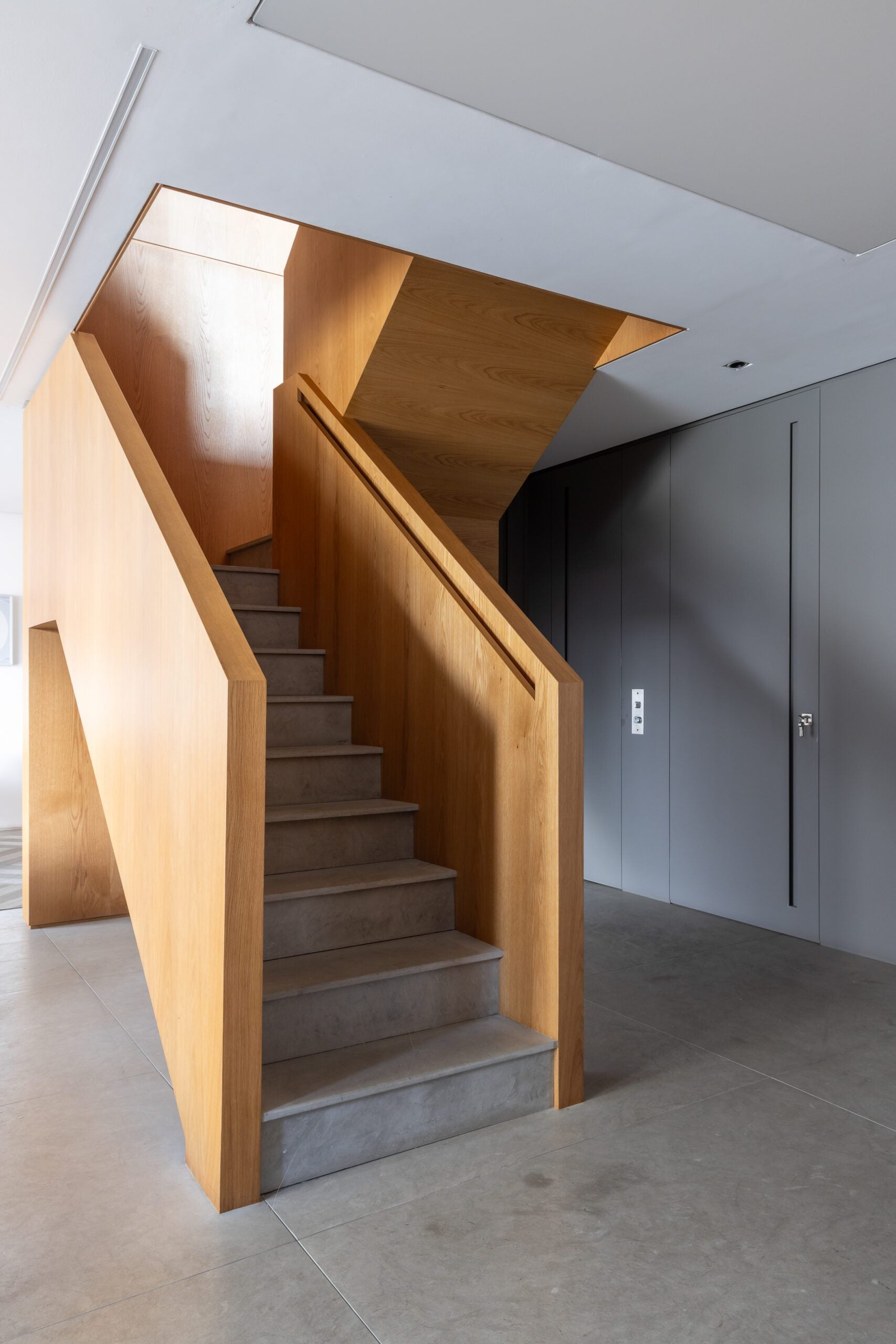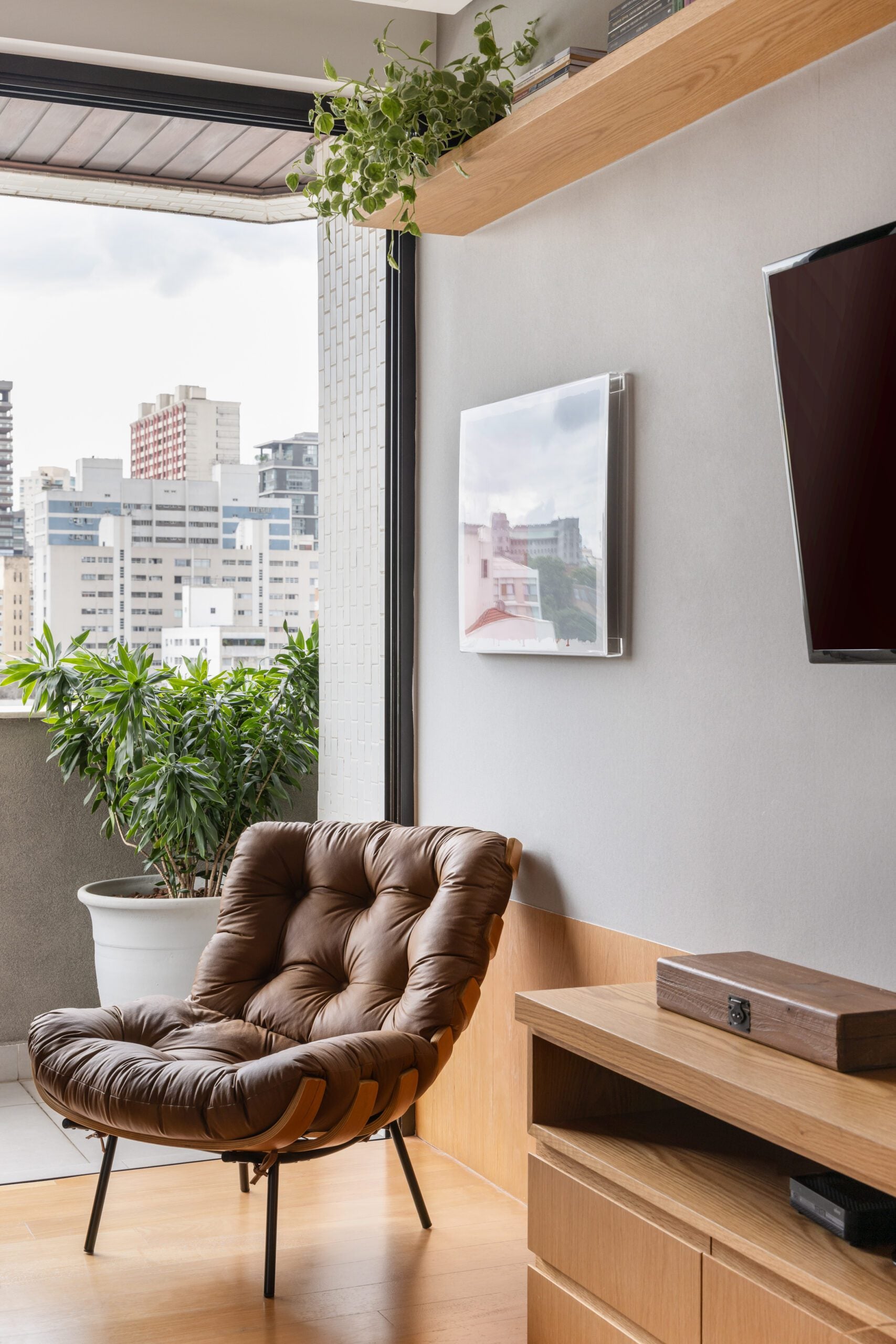O piso em limestone bateig blue, combinado ao forro em madeira de carvalho europeu no pavimento superior, estabelece a base neutra e sofisticada que se repete nos detalhes de cada ambiente. Na área íntima, tacos de tauari aquecem os espaços privados, enquanto banheiros receberam tampos em quartzito cinza, seixos verdes e acabamentos em Armani Grigio. Para completar, peças de design brasileiro e obras de arte cuidadosamente selecionadas trazem personalidade e força ao conjunto. Poltronas de Sérgio Rodrigues, mesa Pétala de Jorge Zalszupin, mesa de jantar de Jader Almeida e tapetes da By Kamy e Punto e Filo convivem em harmonia com quadros de Chiara Banfi, fotografias de Cláudio Edinger e Ana Nitzan, além de esculturas de Jacqueline Terpins.