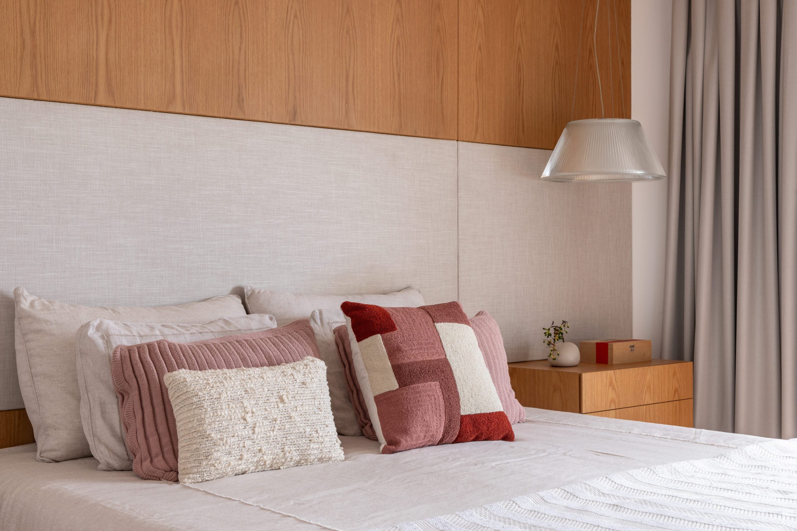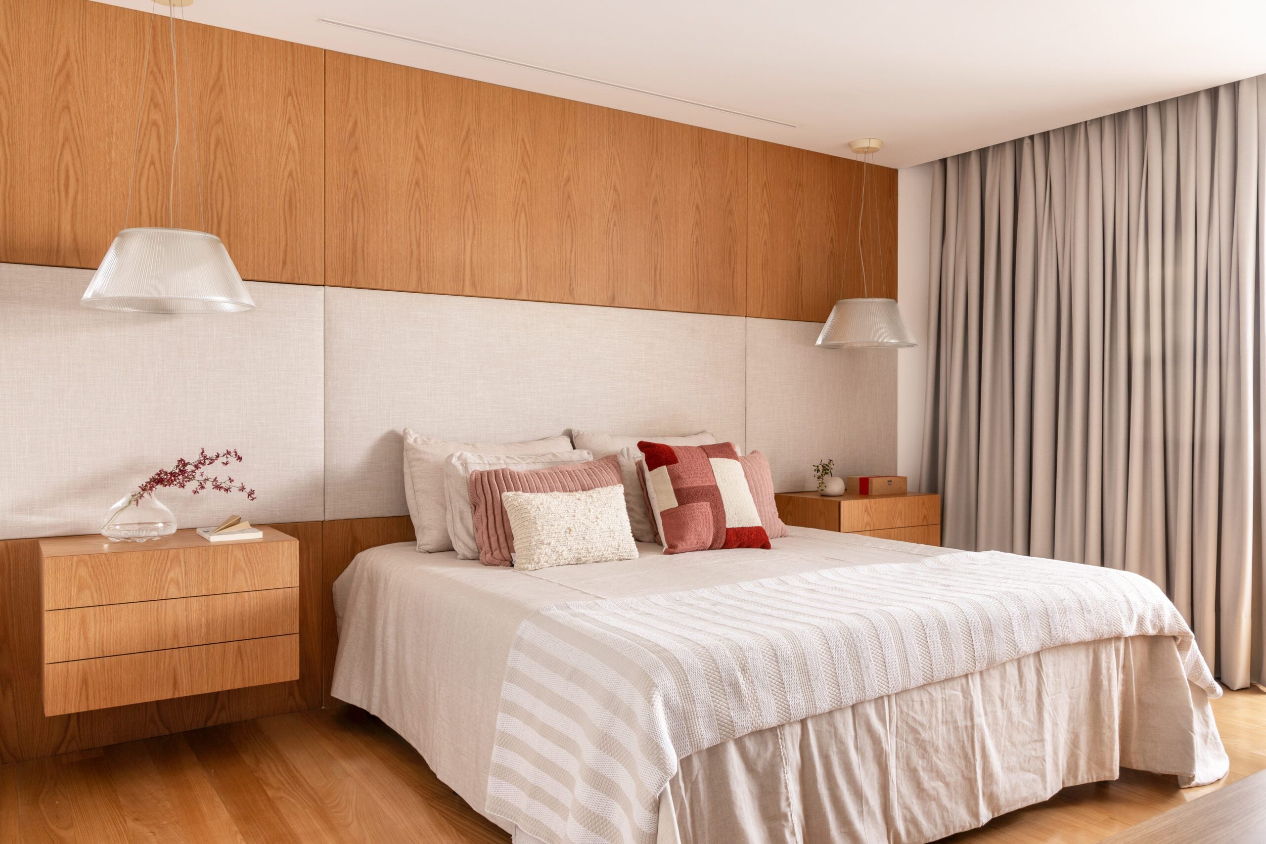 O antigo imóvel de três dormitórios e três banheiros deu lugar a quatro suítes, sendo a master desenhada com banheiro duplo para o casal. Uma das principais soluções técnicas foi a instalação de uma plataforma elevatória entre o hall de entrada e o lavabo, decisão que exigiu ajustes estruturais, mas trouxe conforto e acessibilidade ao projeto. A marcenaria, cuidadosamente planejada, foi um dos pontos altos: painéis escondem portas de entrada, cozinha e lavabo, criando uma leitura visual contínua. Toda a madeira utilizada foi selecionada em um mesmo lote, garantindo unidade entre painéis, móveis desenhados sob medida e peças reaproveitadas do antigo apartamento, como a mesa de jantar e o móvel de TV, ambos refolheados em carvalho americano.