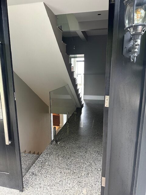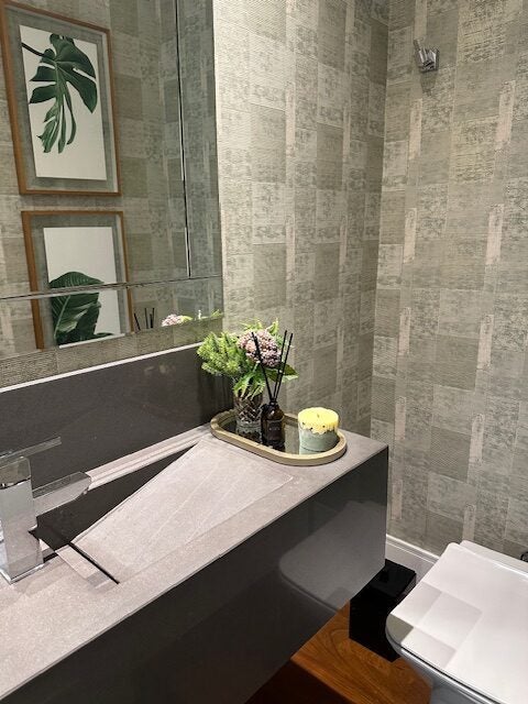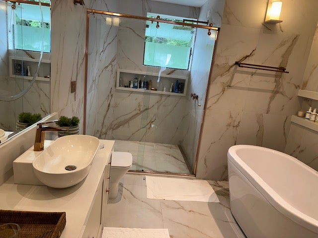 Portas camufladas levam ao banheiro revestido em calacata, proporcionando sofisticação ao ambiente.