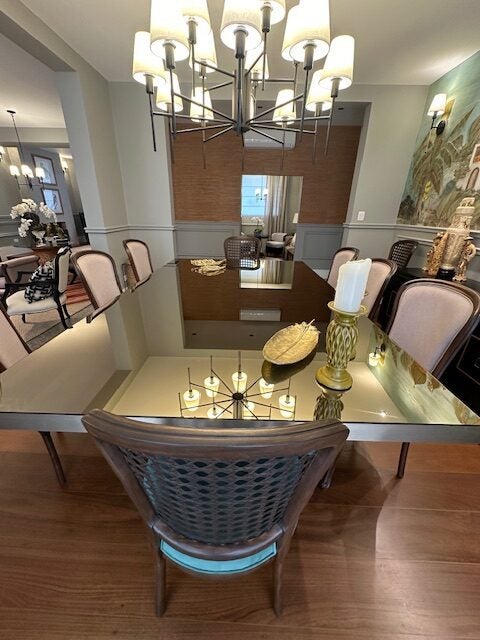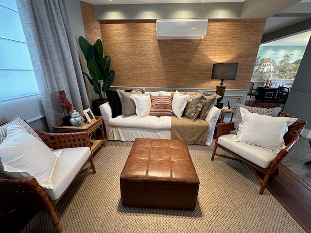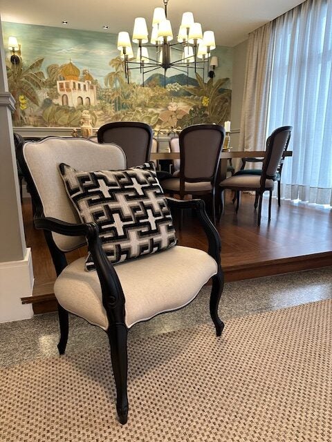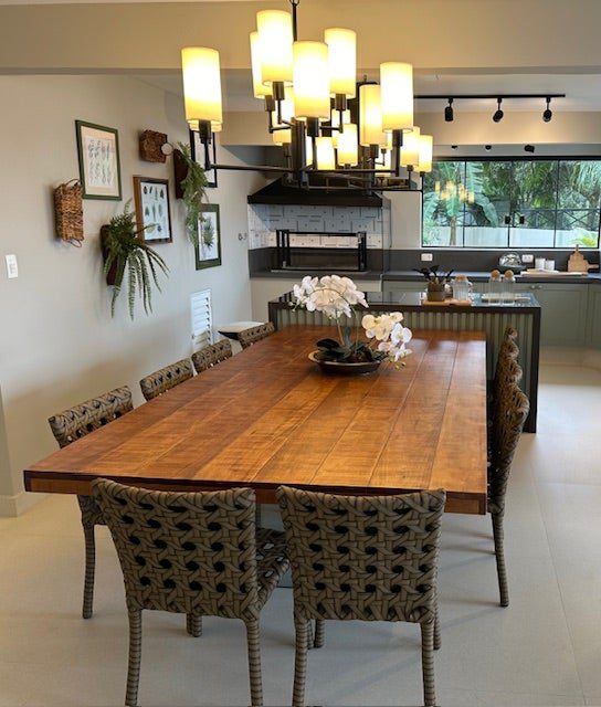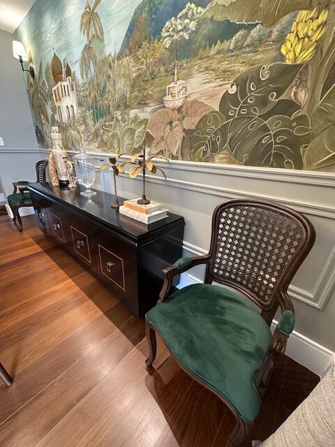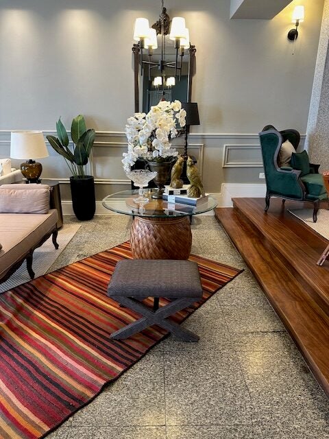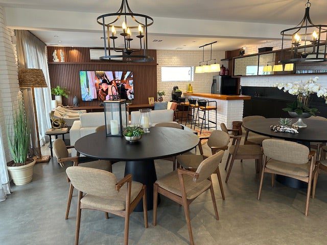 No hall de entrada, o living surpreende com uma atmosfera acolhedora, onde a sala de jantar combina mobiliário clássico e contemporâneo, e o trompe l’oeil no fundo conecta o ambiente à paisagem natural ao redor.