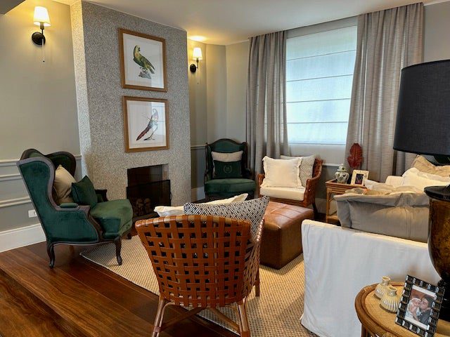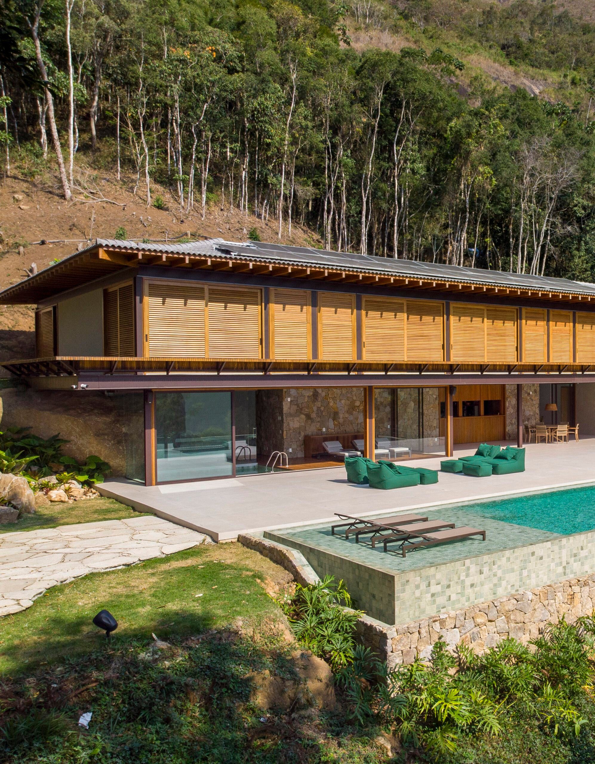 A construção em morro cria um efeito de degraus no estar e na área da lareira, com móveis variados em estilo clássico, contemporâneo e fibras naturais, compondo uma atmosfera equilibrada e aconchegante.
