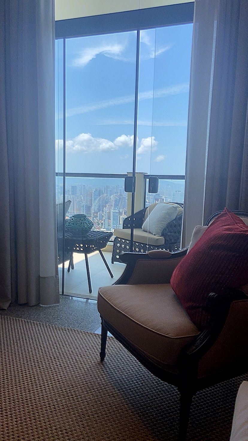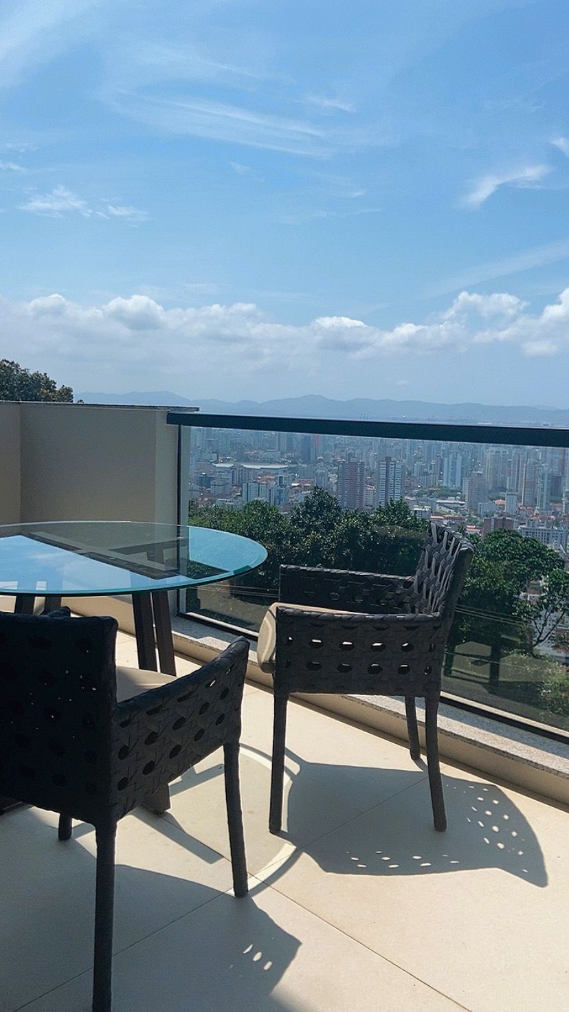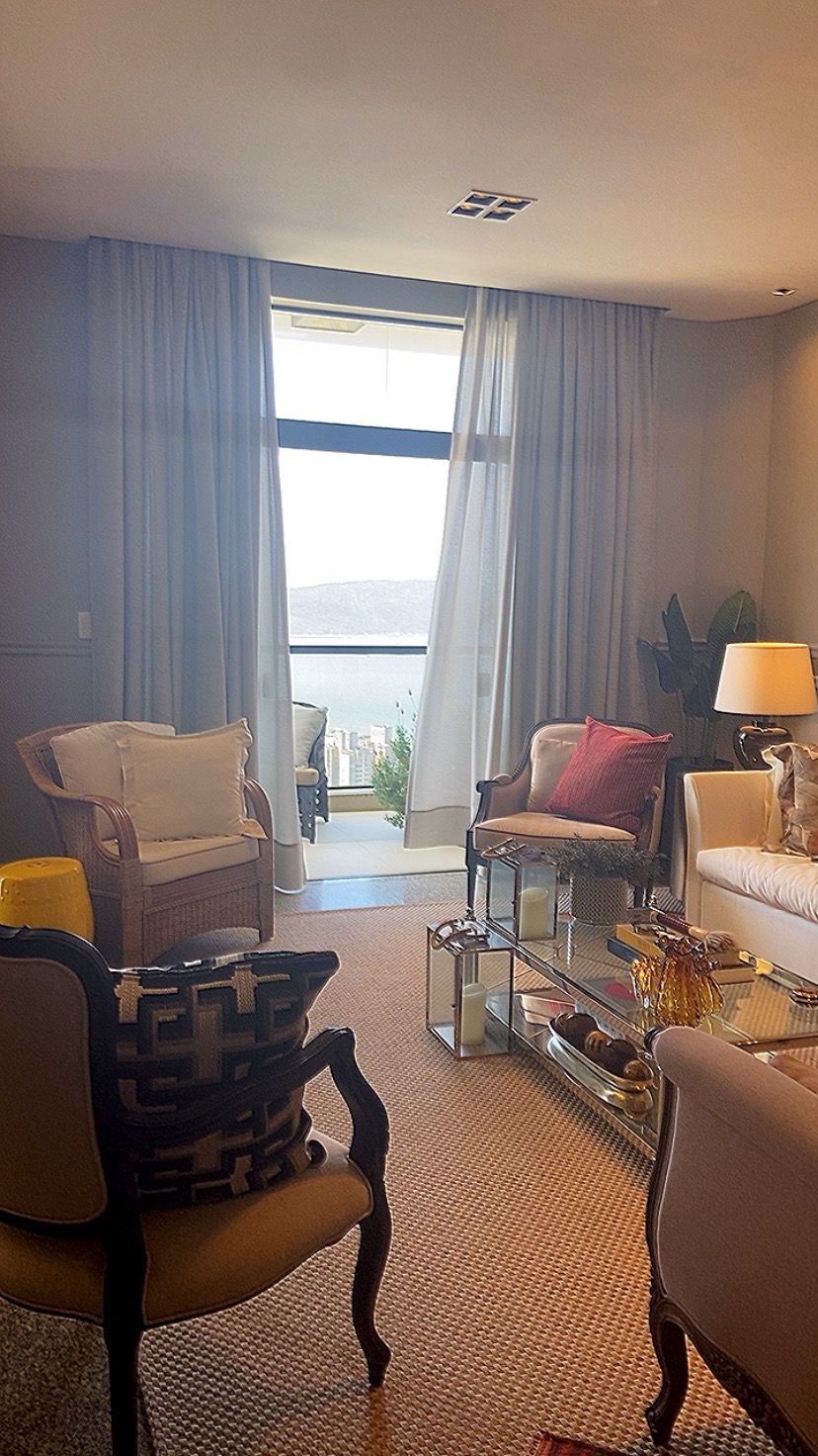 Grandes panos de vidro se abrem para a varanda com vista para o mar.