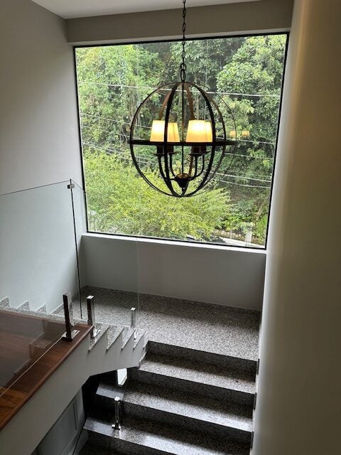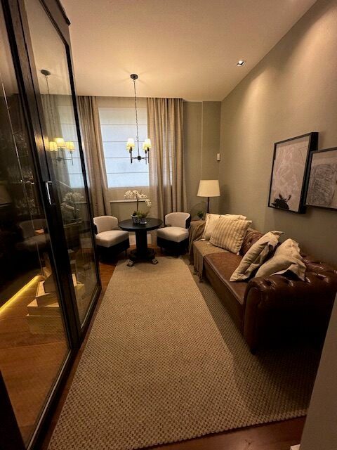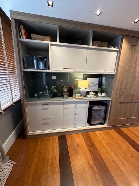 No andar superior, uma sala íntima se abre para a TV, acompanhada de uma pequena cozinha para lanches rápidos.