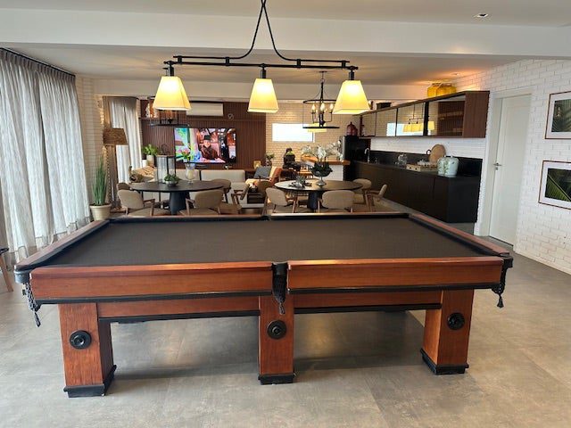 A mesa de bilhar em preto completa o espaço de entretenimento.