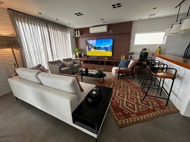O espaço de lazer é um convite à diversão, com uma sala de jogos, sofá confortável e TV para shows e eventos.