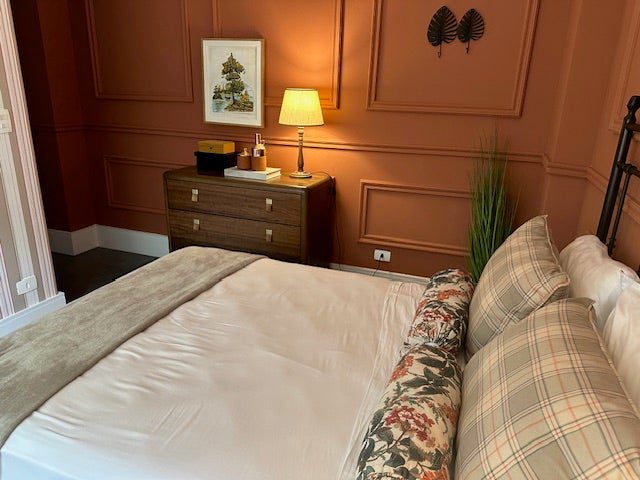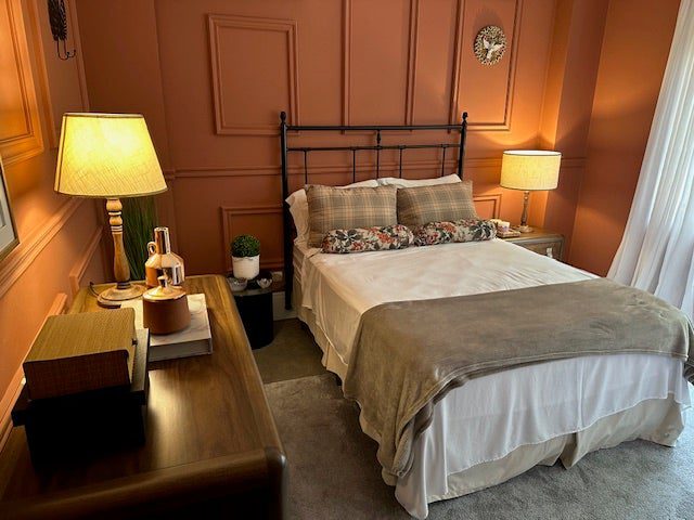 O quarto em tons terrosos remete a chalés de praia, enquanto o quarto de solteiro, em azul, evoca o estilo provençal.