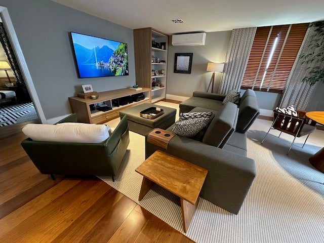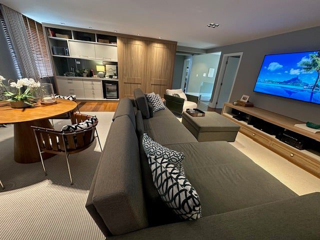 Com 740m² e uma vista privilegiada para o mar, esta residência foi adaptada para um jovem casal, preservando a arquitetura dos anos 1970 com toques modernos. O estilo clássico foi mesclado com linhas contemporâneas, conferindo leveza e sofisticação aos ambientes.