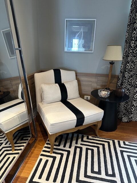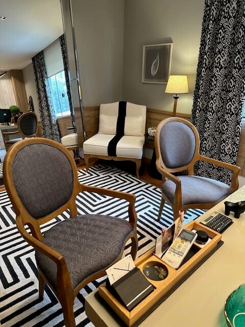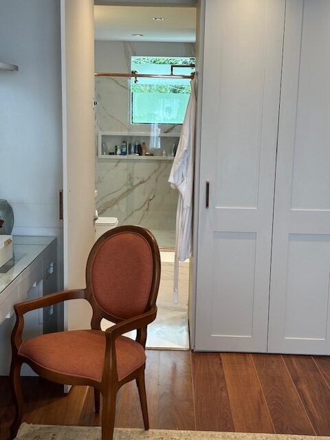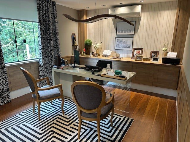 O espaço ainda conta com um escritório decorado em tons neutros, com boiseries e poltronas de veludo preto.