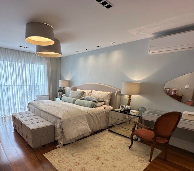 A suíte principal em tons de azul oferece tranquilidade, com cômodas em estilo francês.