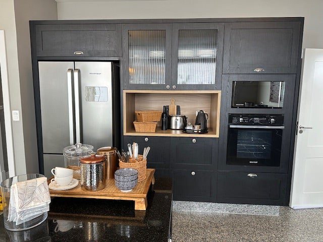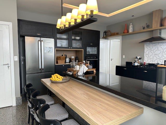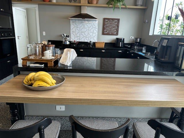 Na cozinha, o contraste clássico do preto e branco traz uma estética que atravessa o tempo.