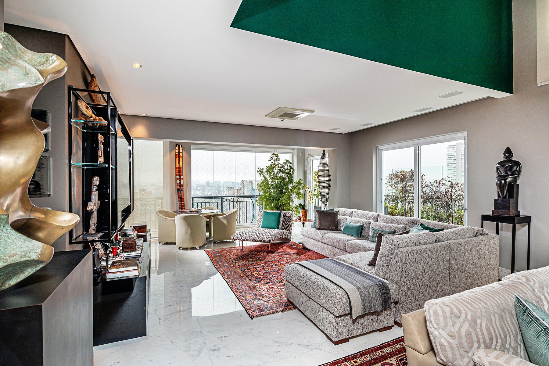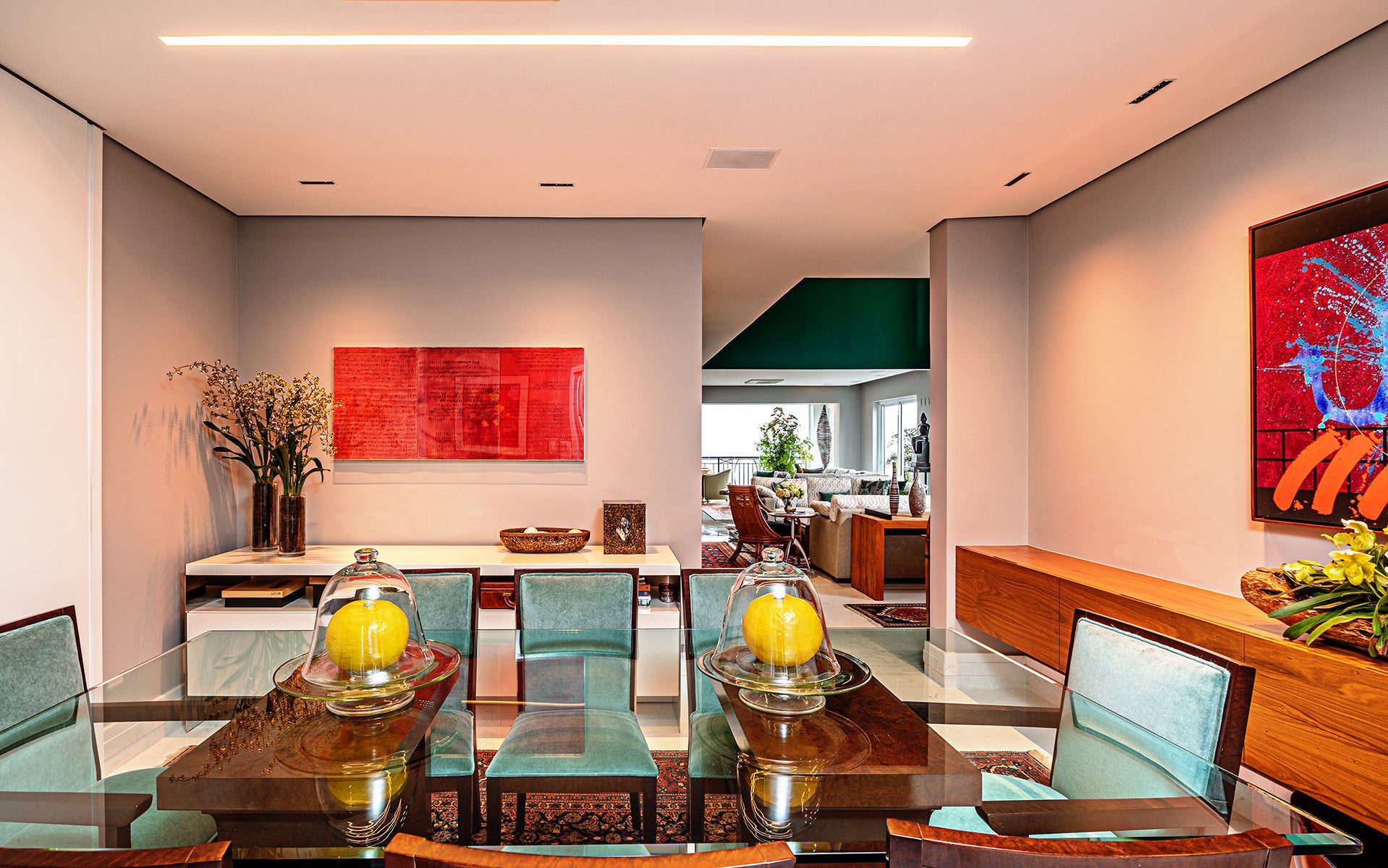A decoração ganha toques autorais com obras como o quadro de Silvio Oppenheim, que reforça a elegância e a personalidade dos ambientes.
