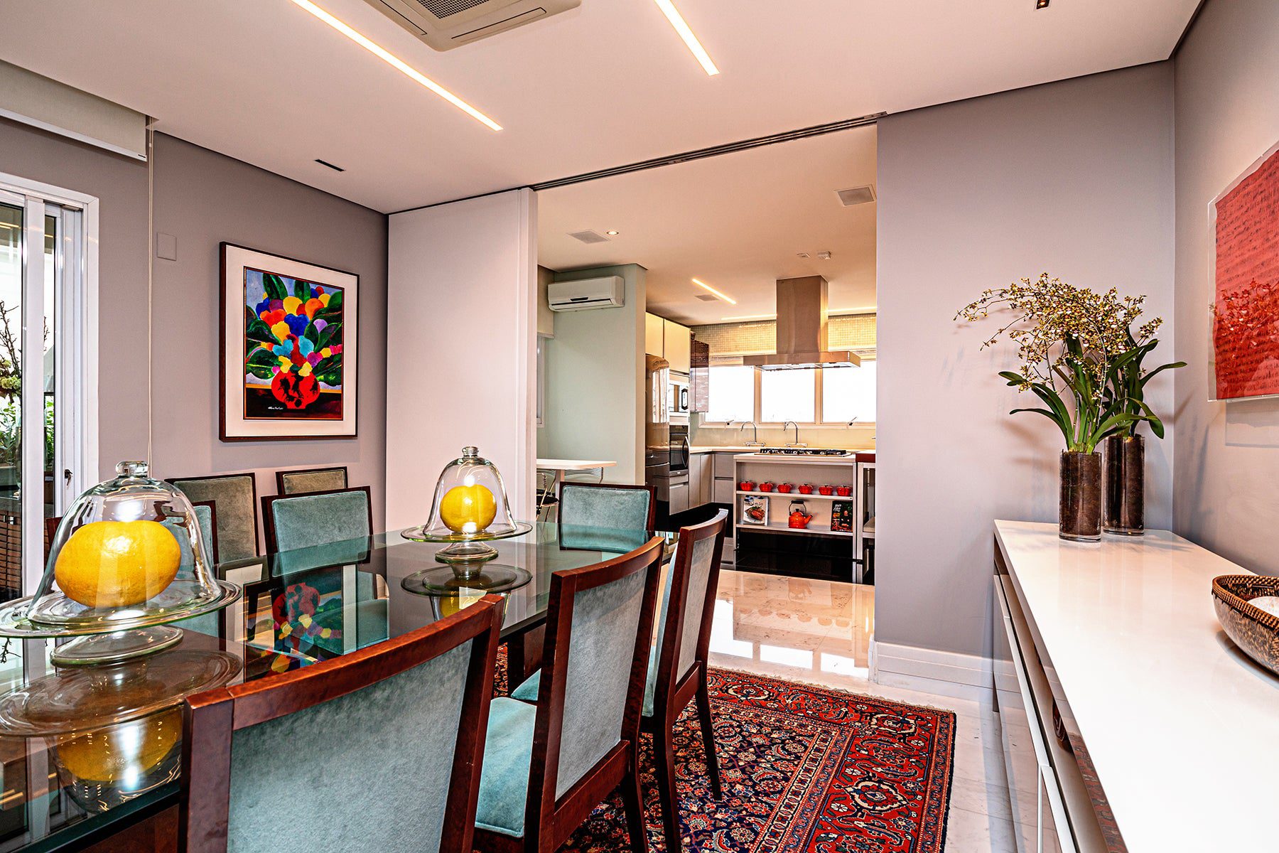A cozinha conta com fechamento que permite isolamento da sala de jantar, garantindo mais privacidade.