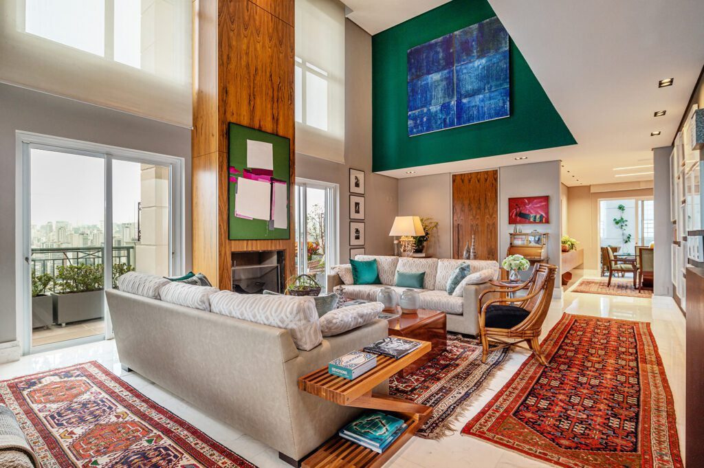 O living de pé-direito duplo valoriza a amplitude do espaço e abriga uma parede repleta de quadros.
