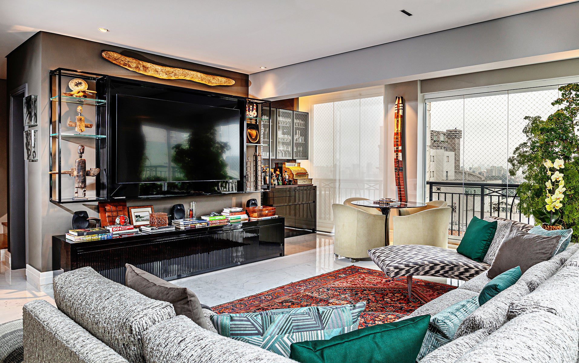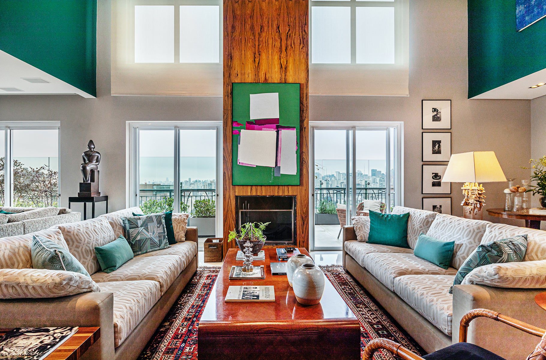 Na sala de estar, a lareira ganha destaque, compondo com o mobiliário da Álvaro Estofados Eireli e mesa de centro da Vermeil. Tecidos da Quaker conferem textura e aconchego ao ambiente.