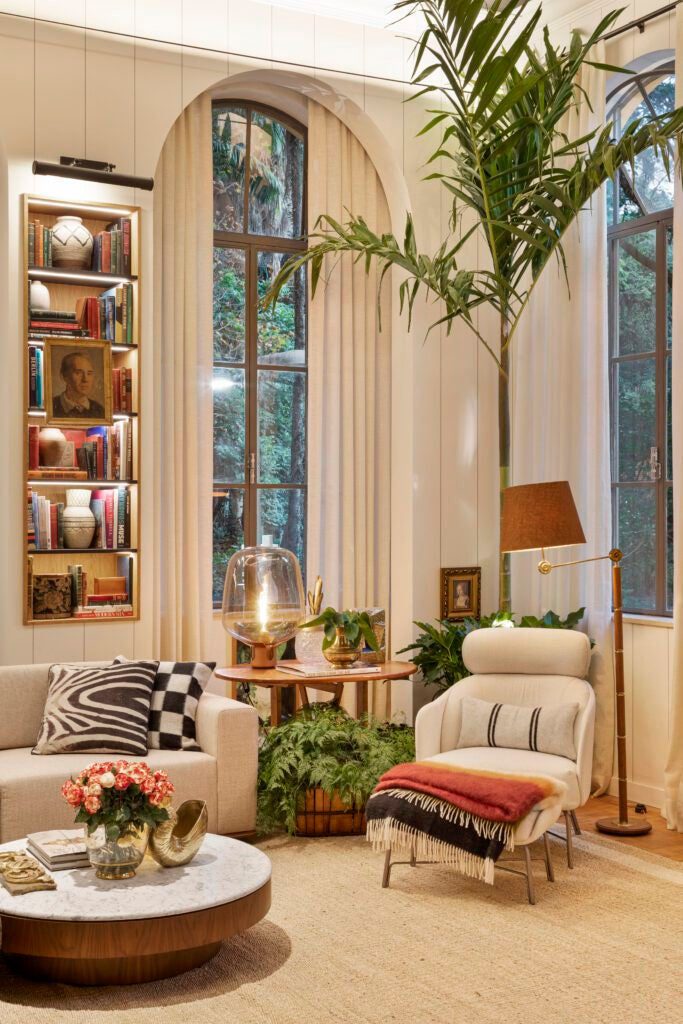 Uma lareira imponente, revestida com pedra natural fornecida pela Boutique della Rocca e executada pela Santorini Mármores, se torna ponto focal, adornada por uma obra expressiva de Andrey Rossi. O diálogo com a arquitetura original aparece também em elementos como o quadro com imagem de arcos e a porta de espelho arqueada do acervo Arnaldo Danemberg Collection, que amplia o espaço e reflete luz com maestria.