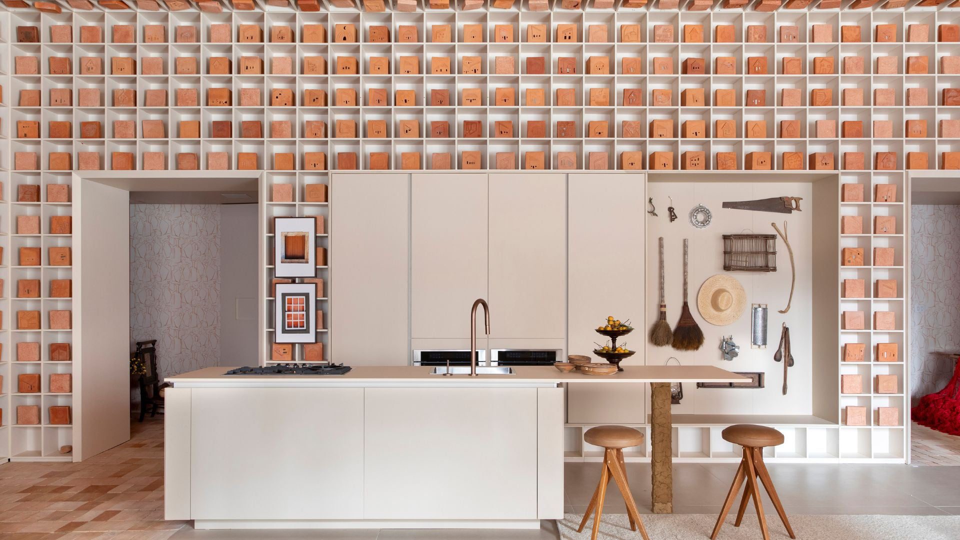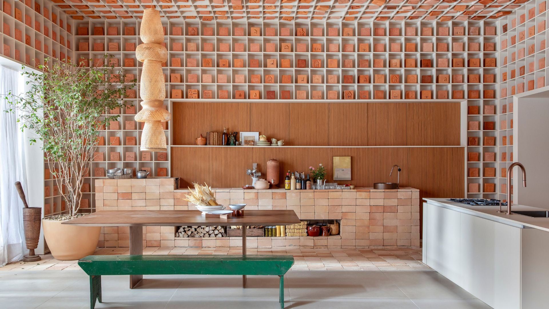 Um raio de sol reflete na superfície da chaleira e formas de alumínio sobre o fogão a lenha. O filtro de barro convive harmoniosamente com garrafas de Velho Barreiro na bancada de tijolos. Essas cenas costumam estar na casa de qualquer cidade do interior do Brasil, mas elas fazem parte de um dos ambientes mais criativos e surpreendentes da CASACOR SP 2024, assinado pelo arquiteto Gabriel Fernandes. Ele ressignifica a casa de pau a pique e mostra que elementos da cultura caipira viram luxo em uma moradia contemporânea.