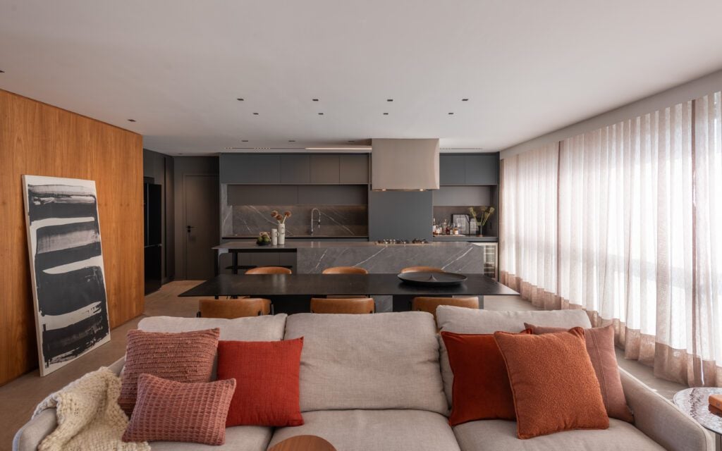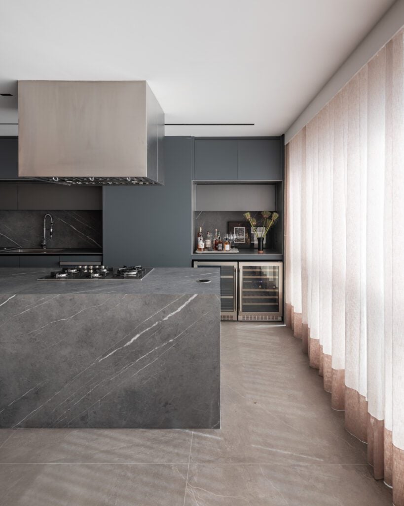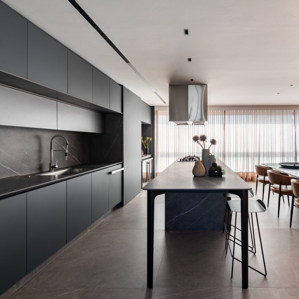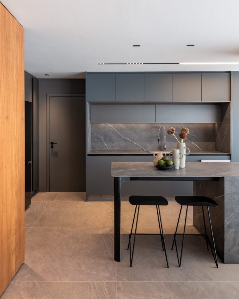 Na cozinha, o grafite unifica o ambiente e camufla portas de serviço. A ilha central, além de funcional, é o coração do espaço, servindo tanto para refeições rápidas quanto para momentos de convivência.