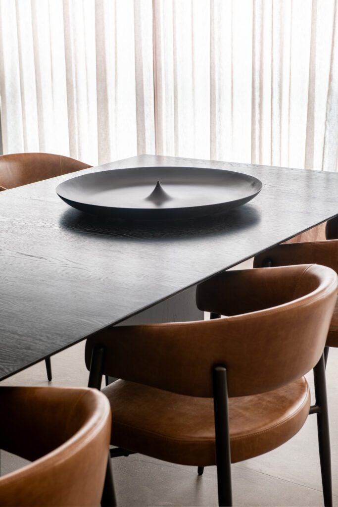 A sala de jantar é marcada pela mesa Fio, de Jacqueline Terpins, em carvalho ebanizado, acompanhada de cadeiras em couro caramelo, em uma combinação de descontração e sofisticação.