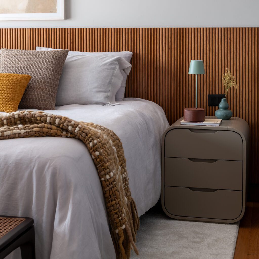 O quarto do casal foi concebido como um refúgio moderno e acolhedor. O painel frisado em Freijó integra cama e mesas de cabeceira em tom fendi. Acima, quadros de Livia Frigo, em óleo sobre papel algodão, reforçam a atmosfera contemporânea e personalizada. O ambiente ainda abriga um home office funcional, onde tons neutros e texturas garantem conforto sem abrir mão da praticidade.
