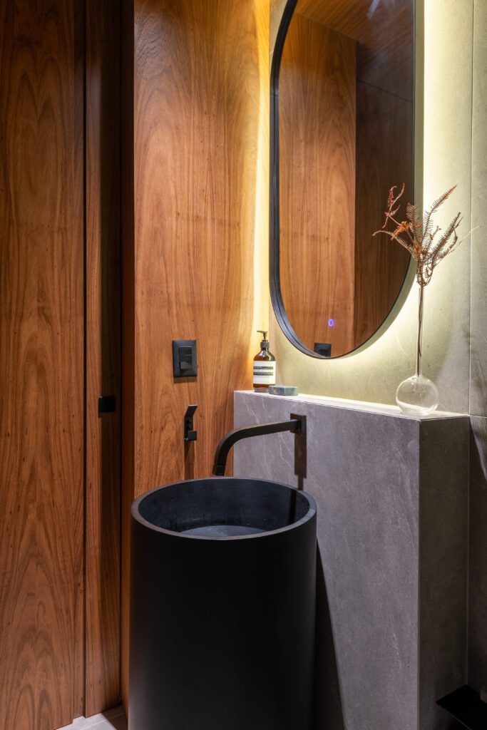O escritório Consuelo Jorge Arquitetos explorou uma paleta de cores neutras, aquecida pela madeira, pelo couro e por tons sofisticados como grafite, mostarda e terracota. A madeira Freijó assume o protagonismo, especialmente no hall e no lavabo, onde reveste paredes e tetos, criando uma atmosfera envolvente e elegante.