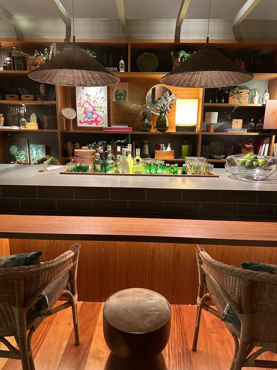 Na cozinha, o grafite unifica o ambiente e camufla portas de serviço. A ilha central, além de funcional, é o coração do espaço, servindo tanto para refeições rápidas quanto para momentos de convivência.