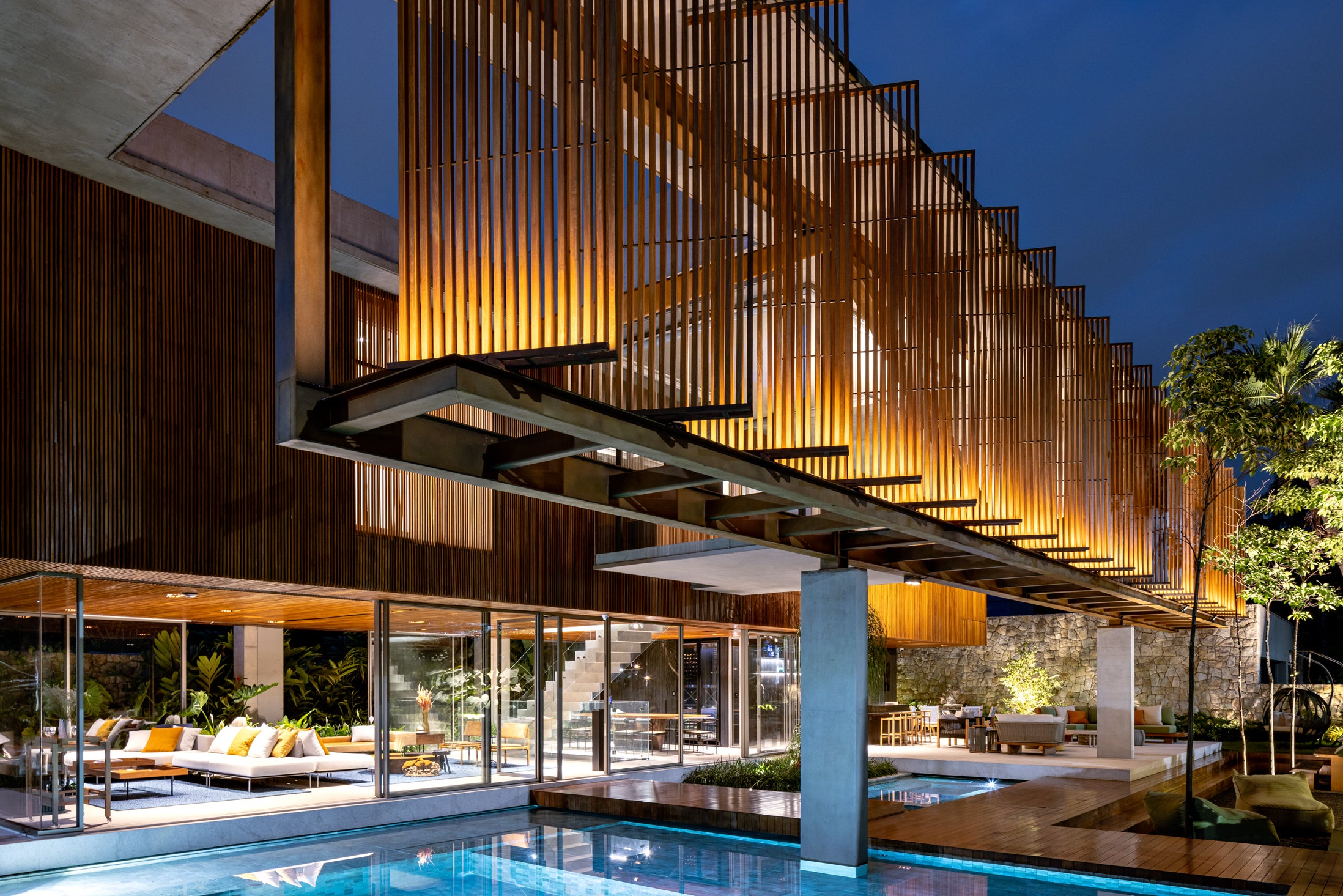 À noite, a proposta ganha novo ritmo com um projeto luminotécnico assinado por Carlos Fortes, que valoriza texturas e volumes com luz indireta e focal, sem ofuscar a natureza ou o olhar.