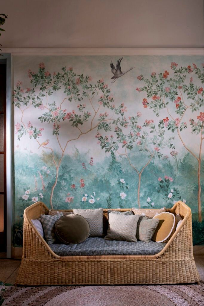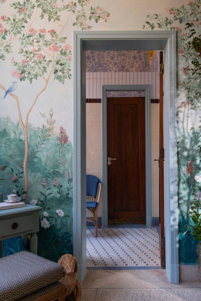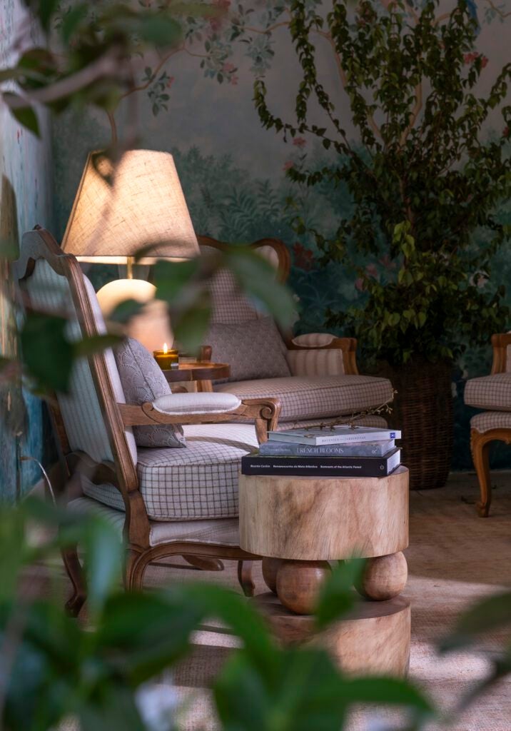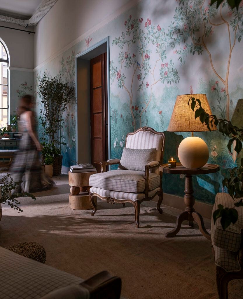 No jardim de inverno, espécies nativas da Mata Atlântica compõem um paisagismo exuberante e sustentável, assinado pela Reurbe, em diálogo com móveis entalhados em jequitibá, tapeçarias retrô, fibras naturais e uma chinoiserie feita à mão que reveste as paredes como se fizesse parte da história do lugar. Cada detalhe revela pesquisa, afeto e o desejo de provocar uma pausa: entre eles, o “canto da poesia”, onde livros, ramos de eucalipto e uma escrivaninha criam um cenário para o ócio criativo.