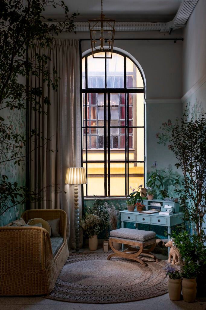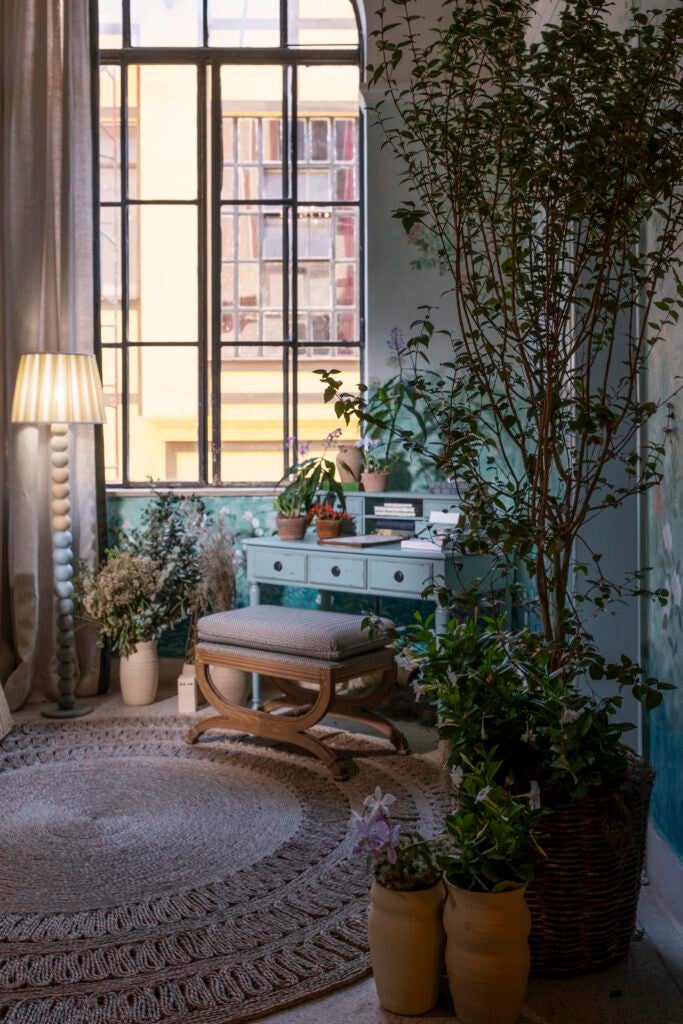 A composição visual tem ritmo e textura. A escrivaninha clássica ao lado da cortina longa e dramática contrasta com a leveza das plumas de rabo-de-burro, enquanto vasos de cerâmica marfim e luminárias exclusivas equilibram rusticidade e sofisticação. Os objetos escolhidos não apenas decoram — eles contam histórias, despertam lembranças e ativam emoções. O espaço é ao mesmo tempo real e onírico, como se o tempo tivesse desacelerado ali dentro.