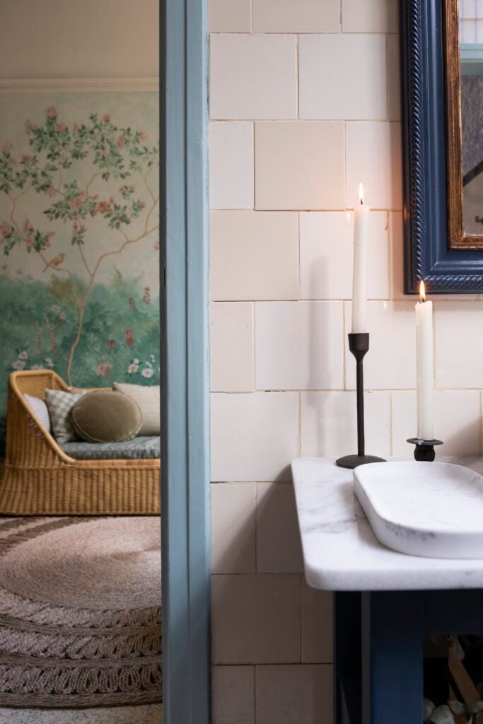 No banheiro, Fernanda opta por restaurar os azulejos originais e preservar a estrutura centenária, revelando uma curadoria delicada de materiais e um olhar respeitoso à história do prédio. As portas em madeira maciça foram recuperadas manualmente, assim como rodapés e batentes moldados com a madeira original. As camadas do tempo são mantidas à vista — não como imperfeições, mas como marcas da autenticidade.