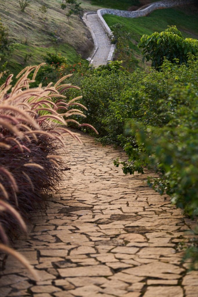 Os caminhos do jardim se desenrolam de forma sinuosa, ladeados por lantanas perfumadas que atraem borboletas e a abelha Jataí, nativa do Brasil. Pequenas áreas de descanso convidam à contemplação, como um redário cercado por lavandas, que exala um aroma envolvente. Um pomar com jabuticabeiras, pitangueiras, mini pitangas e amoreiras convida à interação: cada árvore é identificada com plaquinhas, aproximando os moradores da flora local.